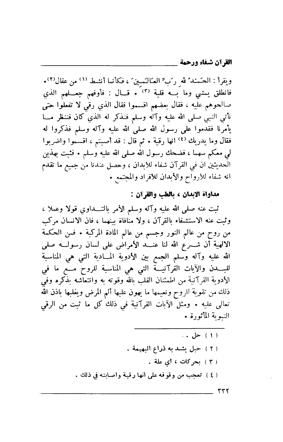 ويقرأ: الحمد لله رب العالمين، فكأنما أنشط (1) من عقال (2). فانطلق يمشي وما به قلبة (3). قال: فأوفهم جعلهم الذي صالحوهم عليه، فقال بعضهم أقسموا فقال الذي رقي لا تفعلوا حتى نأتي النبي - صلى الله عليه وسلم - فنذكر له الذي كان فننظر ما يأمرنا فقدموا على رسول الله - صلى الله عليه وآله وسلم - فذكروا له فقال وما يدريك (4) أنها رقية. ثم قال: قد أصبتم، أقسموا واضربوا لي معكم سهماً، فضحك رسول الله - صلى الله عليه وسلم -. فثبت بهذين الحديثين أن في القرآن شفاء للأبدان، وحصل عندنا من جميع ما تقدم أنه شفاء للأرواح والأبدان للأفراد والمجتمع.