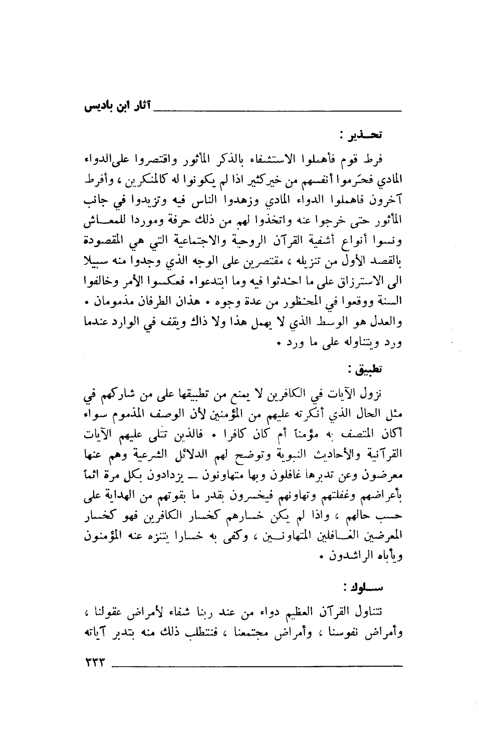 فرط قوم فأهملوا الإستشفاء بالذكر المأثور واقتصروا على الدواء المادي فحرموا أنفسهم من خير كبير إذا لم يكونوا له كالمنكرين، وأفرط آخرون فأهملوا الدواء المادي وزهدوا الناس فيه وتزيدوا في جانب المأثور حتى خرجوا عنه واتخذوا لهم من ذلك حرفة ومورداً لمعاش ونسوا أنواع أشفية القرآن الروحية والإجتماعية التي هي المقصودة بالقصد الأول من تنزيله، مقتصرين على الوجه الذي وجدوا منه سبيلاً إلى الإسترزاق على ما أحدثوا فيه وما ابتدعوا. فعكسوا الأمر وخالفوا السنة ووقعوا في المحظور من عدة وجوه. هذان الطرفان مذمومان. والعدل هو الوسط الذي لا يهمل هذا ولا ذاك ويقف في الوارد عندما ورد ويتناوله على ما ورد.