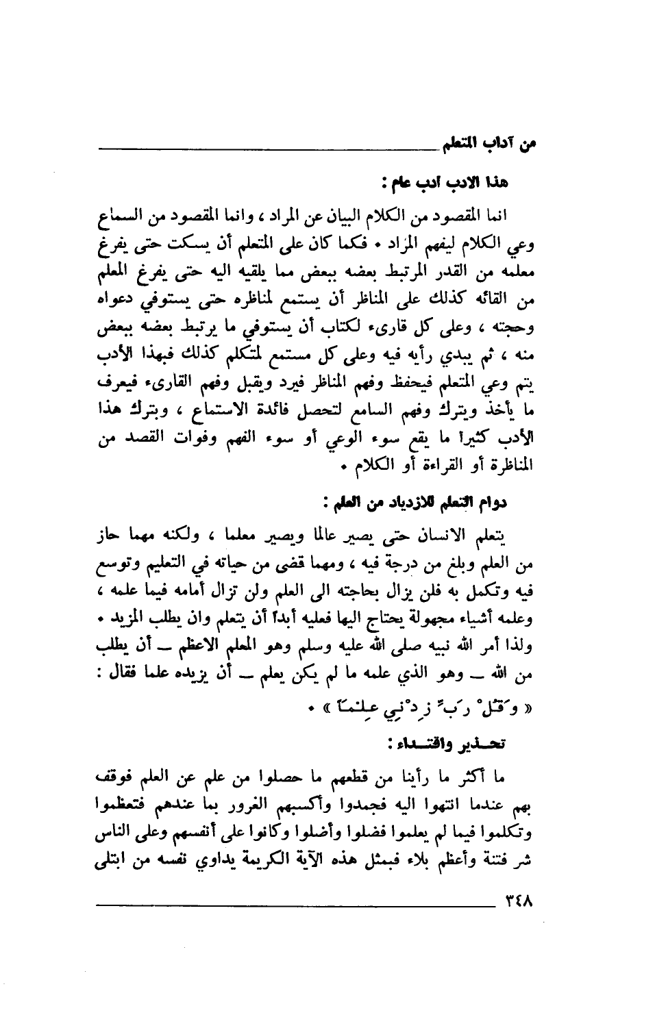 من العلم وبلغ من درجة فيه، ومهما قضى من حياته في التعليم وتوسع فيه وتكمل به فلن يزال بحاجته إلى العلم ولن تزال أمامه فيما علمه، وعلمه أشياء مجهولة يحتاج إليها فعليه أبداً أن يتعلم وأن يطلب المزيد. ولذا أمر الله نبيه صلى الله عليه وسلم وهو المعلم الأعظم- أن يطلب من الله- وهو الذي علمه ما لم يكن يعلم- أن يزيده علماً فقال: {وَقُلْ رَبِّ زِدْنِي عِلْمًا}.