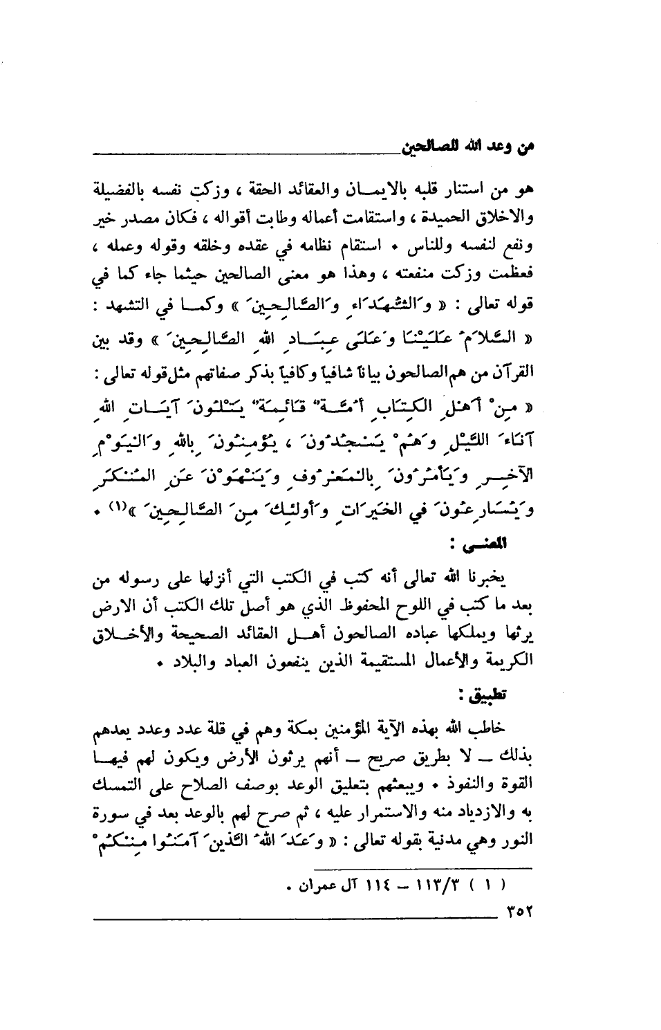 هو من استنار قلبه بالإيمان والعقائد الحقة، وزكت نفسه بالفضيلة والأخلاق الحميدة، واستقامت أعماله وطابت أقواله، فكان مصدر خير ونفع لنفسه وللناس. استقام نظامه في عقده وخلقه وقوله وعمله، فعظمت وزكت منفعته، وهذا هو معنى الصالحين حيثما جاء كما في قوله تعالى: {وَالشُّهَدَاءِ وَالصَّالِحِينَ} وكما في التشهد: «السَّلامُ عَلَيْنَا وَعَلَى عِبَادِ اللَّهِ الصَّالِحِينَ» وقد بين القرآن من هم الصالحون بياناً شافياً وكافياً بذكر صفاتهم مثل قوله تعالى: {مِنْ أَهْلِ الْكِتَابِ أُمَّةٌ قَائِمَةٌ يَتْلُونَ آيَاتِ اللَّهِ آنَاءَ اللَّيْلِ وَهُمْ يَسْجُدُونَ يُؤْمِنُونَ بِاللَّهِ وَالْيَوْمِ الْآخِرِ وَيَأْمُرُونَ بِالْمَعْرُوفِ وَيَنْهَوْنَ عَنِ الْمُنْكَرِ وَيُسَارِعُونَ فِي الْخَيْرَاتِ وَأُولَئِكَ مِنَ الصَّالِحِينَ} (1).