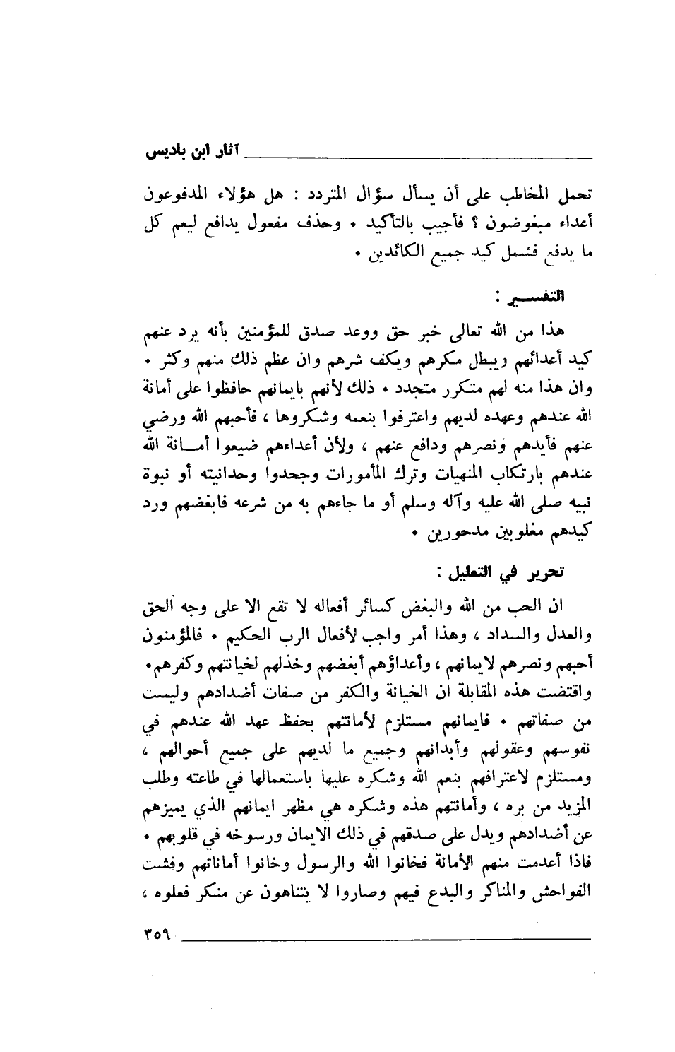 إن الحب من الله والبغض كسائر أفعاله لا تقع إلا على وجه الحق والعدل والسداد، وهذا أمر واجب لأفعال الرب الحكيم. فالمؤمنون أحبهم ونصرهم لإيمانهم، وأعداؤهم أبغضهم وخذلهم لخيانتهم وكفرهم. واقتضت هذه المقابلة أن الخيانة والكفر من صفات أضدادهم وليست من صفاتهم. فإيمانهم مستلزم لأمانتهم بحفظ عهد الله عندهم في نفوسهم وعقولهم وأبدانهم وجميع ما لديهم على جميع أحوالهم، ومستلزم لاعترافهم بنعم الله وشكره عليها باستعمالها في طاعته وطلب المزيد من بره، وأمانتهم هذه وشكره هي مظهر إيمانهم الذي يميزهم عن أضدادهم ويدل على صدقهم في ذلك الإيمان ورسوخه في قلوبهم. فإذا أعدمت منهم الأمانة فخانوا الله والرسول وخانوا أماناتهم وفشت الفواحش والمناكر والبدع فيهم وصاروا لا يتناهون عن منكر فعلوه،