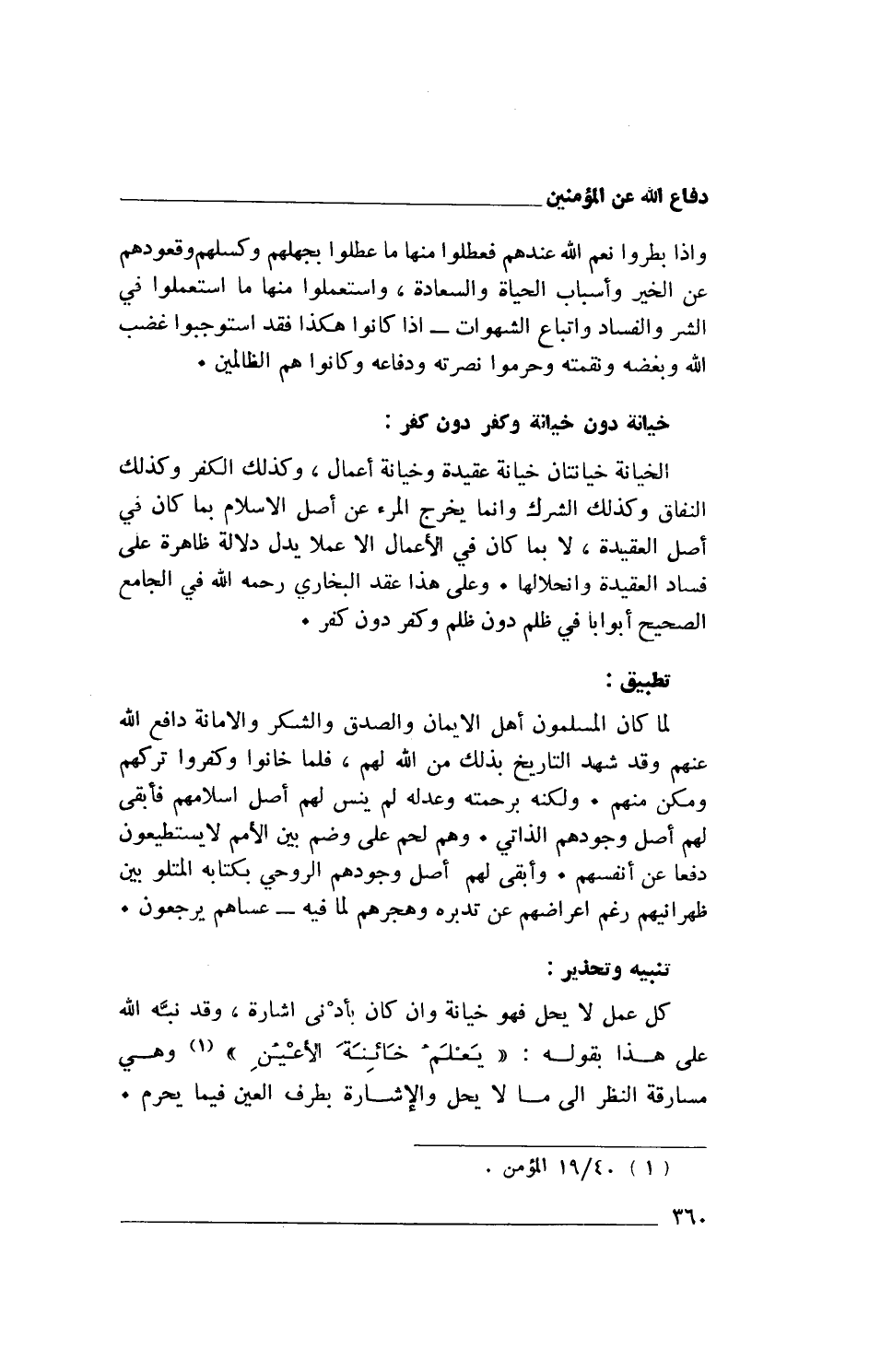 لما كان المسلمون أهل الإيمان والصدق والشكر والأمانة دافع الله عنهم وقد شهد التاريخ بذلك من الله لهم، فلما خانوا وكفروا تركهم ومكن منهم. ولكنه برحمته وعدله لم ينس لهم أصل إسلامهم فأبقى لهم أصل وجودهم الذاتي. وهم لحم على وضم بين الأمم لا يستطيعون دفعاً عن أنفسهم. وأبقى لهم أصل وجودهم الروحي بكتابه المثلو بين ظهرانيهم رغم إعراضهم عن تدبره وهجرهم لما فيه- عساهم يرجعون.