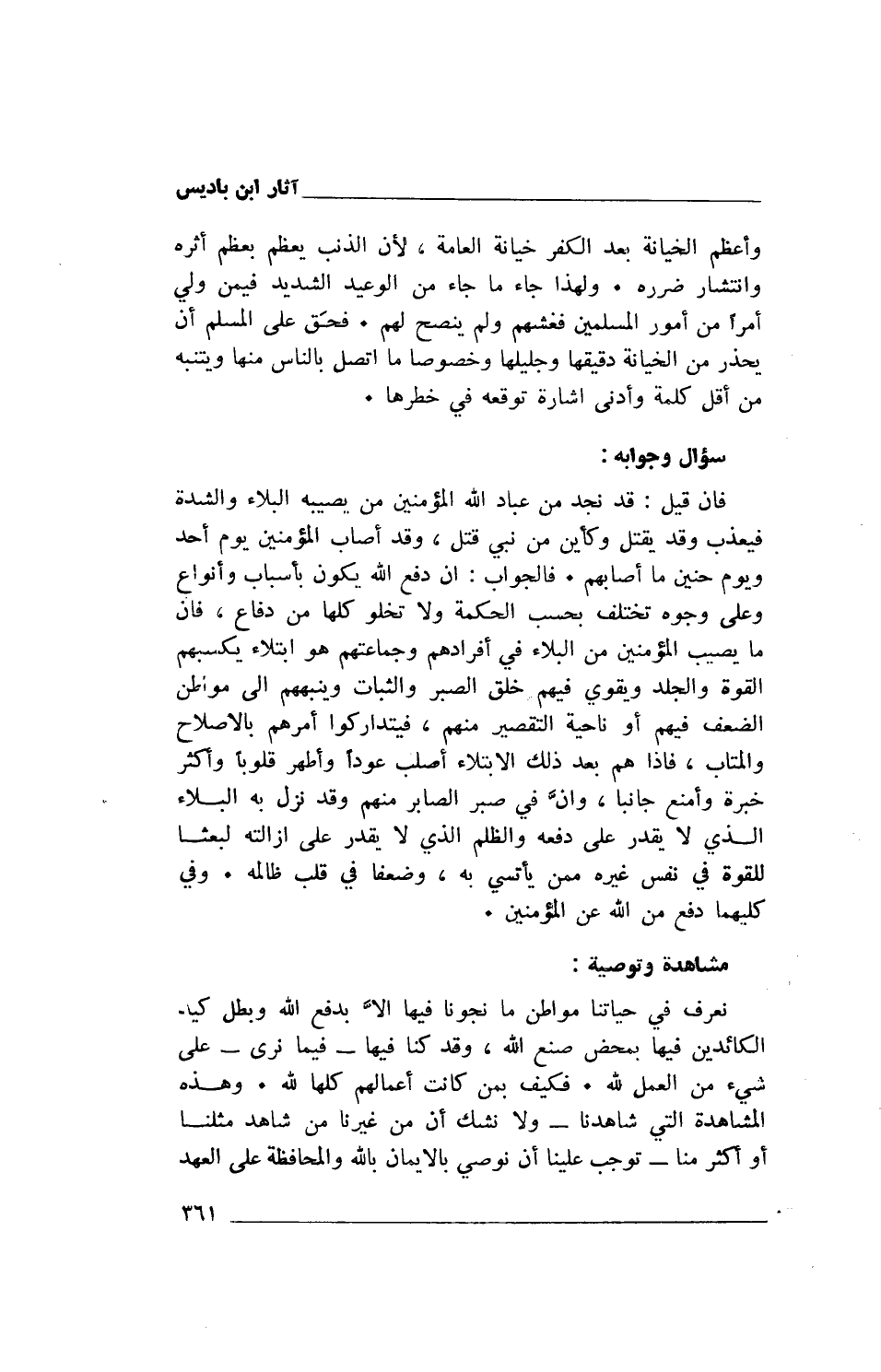 نعرف في حياتنا مواطن ما نجونا فيها إلاَّ بدفع الله وبطل كيد الكائدين فيها بمحض صنع الله، وقد كنا فيها- فيما نرى- على شيء من العمل لله. فكيف بمن كانت أعمالهم كلها لله. وهذه المشاهدة التي شاهدنا- ولا نشك أن من غيرنا من شاهد مثلنا أو أكثر منا- توجب علينا أن نوصي بالإيمان بالله والمحافظة على العهد