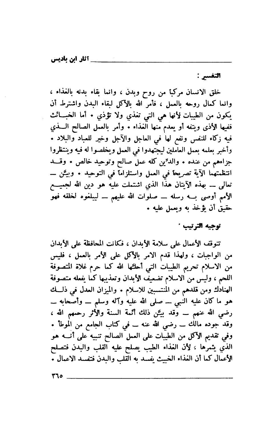 من الواجبات، ولهذا قدم الأمر بالأكل على الأمر بالعمل، فليس من الإسلام تحريم الطيبات التي أحلَّها الله كما حرم غلاة المتصوفة اللحم، وليس من الإسلام تضعيف الأبدان وتعذيبها كما يفعله متصوفة الهنادك ومن قلدهم من المنتسبين للإسلام. والميزان العدل في ذلك هو ما كان عليه النبي- صلى الله عليه وآله وسلم- وأصحابه- رضي الله عنهم- وقد بيَّن ذلك أئمة السنة والأثر رحمهم الله، وقد جوده مالك- رضي الله عنه- في كتاب الجامع من الموطأ. وفي تقديم الأكل من الطيبات على العمل الصالح تنبيه على أنه هو الذي يثمرها، لأن الغذاء الطيب يصلح عليه القلب والبدن فتصلح الأعمال كما أن الغذاء الخبيث يفسد به القلب والبدن فتفسد الأعمال.