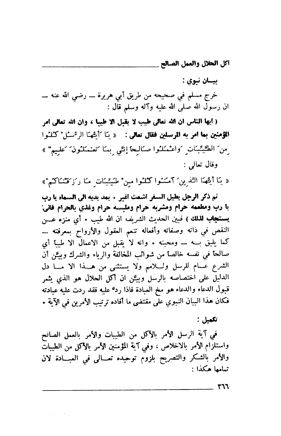 وأنه لا يقبل من الأعمال إلا طيباً أي صالحاً في نفسه خالصاً من شوائب المخالفة والرياء والشرك وبين أن الشرع عام للرسل وللأمم ولا يستثنى من هذا إلا ما دل الدليل على اختصاصه بالرسل وبيَّن أن أكل الحلال هو الذي يثمر قبول الدعاء والدعاء هو مخ العبادة فإذا ردَّ عليه فقد ردت عليه عبادته فكان هذا البيان النبوي على مقتضى ما أفاده ترتيب الأمرين في الآية.