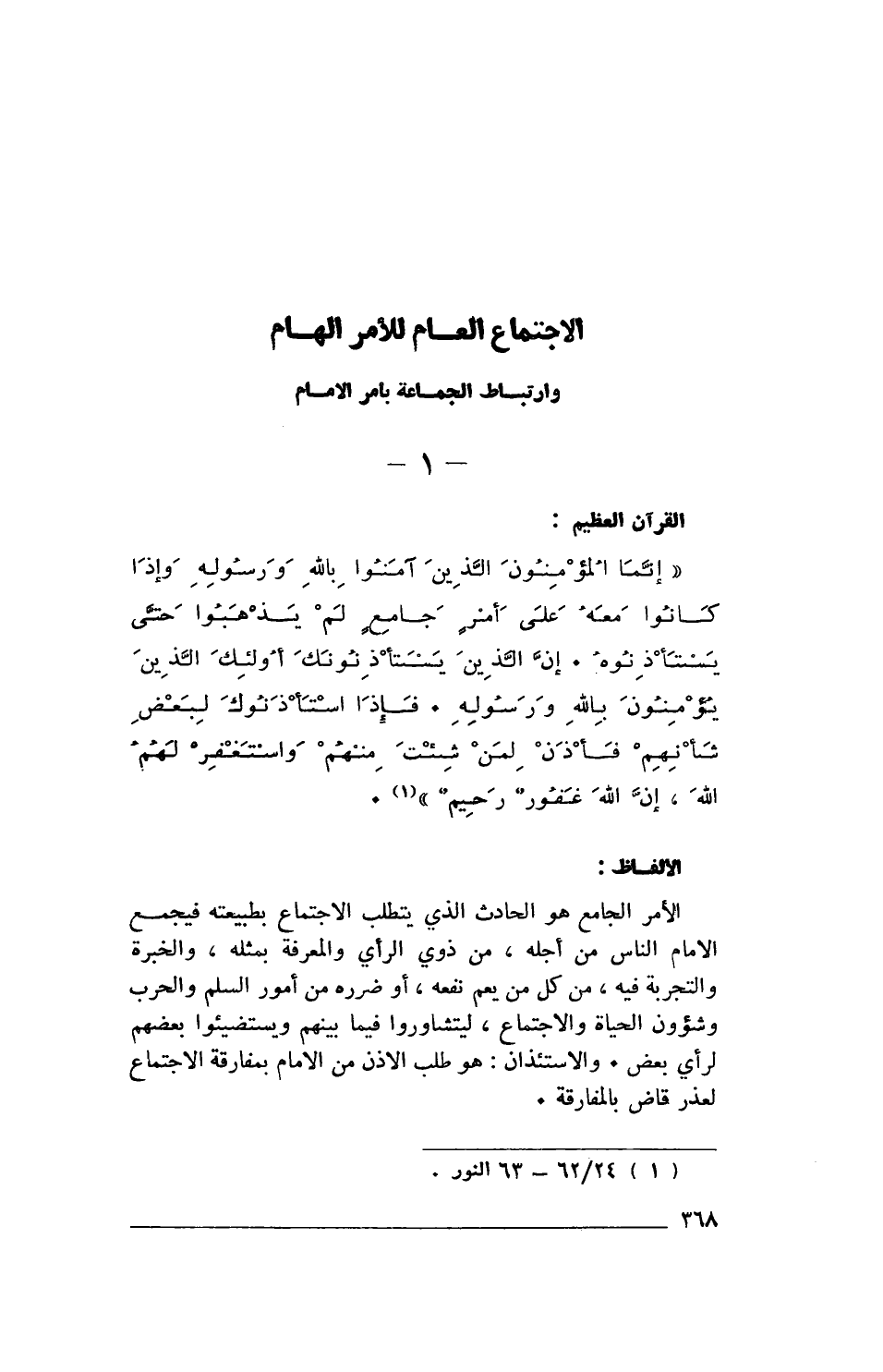 الأمر الجامع هو الحادث الذي يتطلب الاجتماع بطبيعته فيجمع الإمام الناس من أجله، من ذوي الرأي والمعرفة بمثله، والخبرة والتجربة فيه، من كل من يعم نفعه، أو ضرره من أمور السلم والحرب وشؤون الحياة والاجتماع، ليتشاوروا فيما بينهم ويستضيئوا بعضهم لرأي بعض. والإستئذان: هو طلب الإذن من الإمام بمفارقة الإجتماع لعذر قاض بالمفارقة.