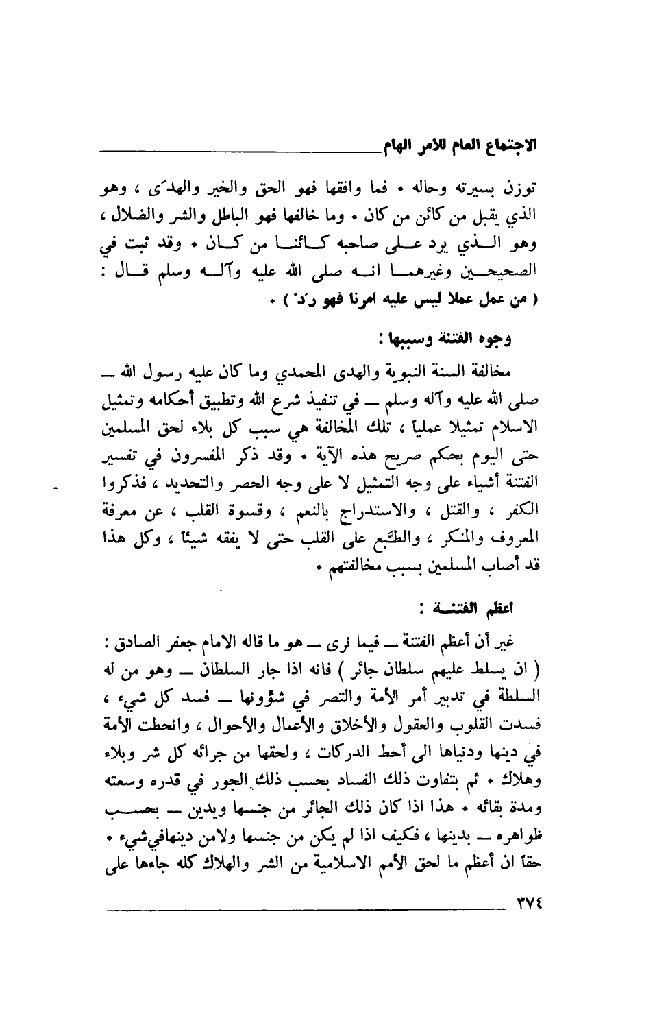 غير أن أعظم الفتنة- فيما نرى- هو ما قاله الإمام جعفر الصادق: (أن يسلط عليهم سلطان جائر) فإنه إذا جار السلطان- وهو من له السلطة في تدبير أمر الأمة والتصرف في شؤونها- فسد كل شيء، فسدت القلوب والعقول والأخلاق والأعمال والأحوال، وانحطت الأمة في دينها ودنياها إلى أحط الدركات، ولحقها من جرائه كل شر وبلاء وهلاك. ثم بتفاوت ذلك الفساد بحسب ذلك الجور في قدره وسعته ومدة بقائه. هذا إذا كان ذلك الجائر من جنسها ويدين- بحسبب ظواهره- بدينها، فكيف إذا لم يكن من جنسها ولا من دينها في شيء. حقاً إن أعظم ما لحق الأمم الإسلامية من الشر والهلاك كله جاءها على