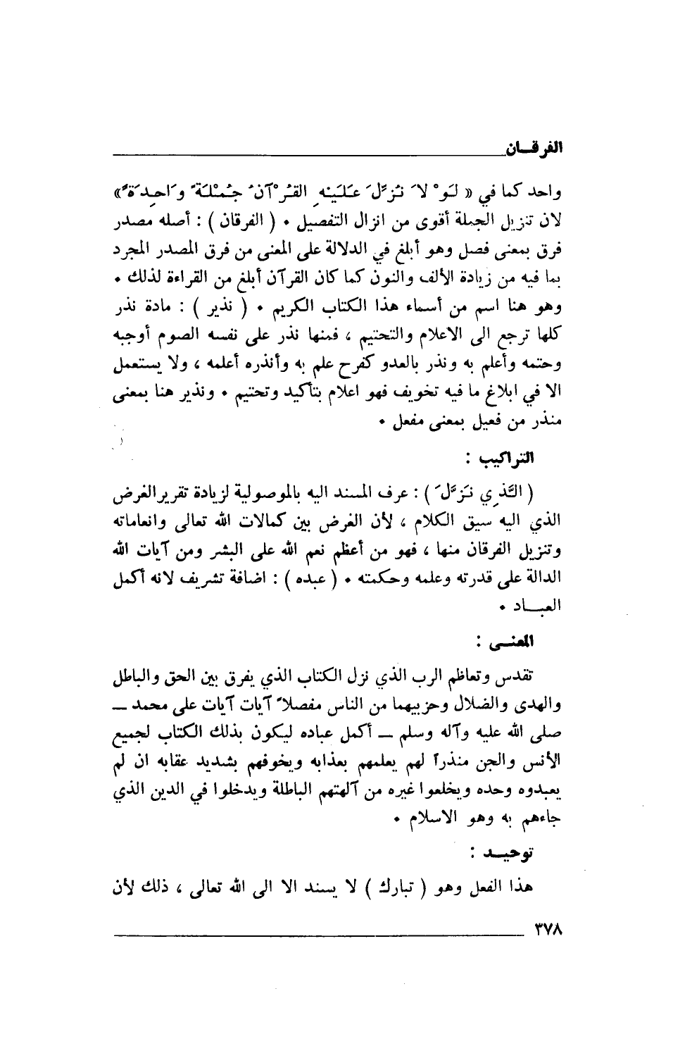 واحدكما في: {لَوْلَا نُزِّلَ عَلَيْهِ الْقُرْآنُ جُمْلَةً وَاحِدَةً} لان تنزيل الجملة أقوى من إنزال التفصيل. (الفرقان): أصله مصدر فرق بمعنى فصل وهو أبلغ في الدلالة على المعنى من فرق المصدر المجرد بما فيه من زيادة الألف والنون كما كان القرآن أبلغ من القراءة لذلك. وهو هنا اسم من أسماء هذا الكتاب الكريم. (نذير): مادة نذر كلها ترجع إلى الإعلام والتحتيم، فمنها نذر على نفسه الصوم أوجبه وحتمه وأعلم به ونذر بالعدو كفرح علم به وأنذره أعلمه، ولا يستعمل إلاَّ في إبلاغ ما فيه تخويف فهو إعلام بتأكيد وتحتيم. ونذير هنا بمعنى منذر من فعيل بمعنى مفعل.