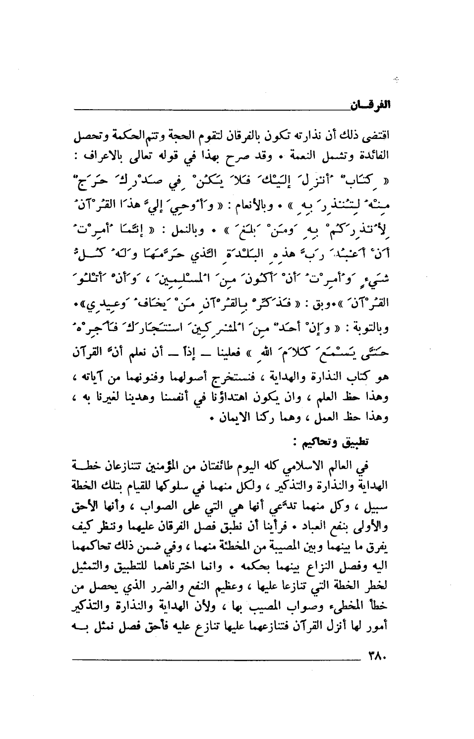 في العالم الإسلامي كله اليوم طائفتان من المؤمنين تتنازعان خطة الهداية والنذارة والتذكير، ولكل منهما في سلوكها للقيام بتلك الخطة سبيل، وكل منهما تدَّعي أنها هي التي على الصواب، وأنها الأحق والأولى بنفع العباد. فرأينا أن نطبق فصل الفرقان عليهما وننظر كيف يفرق ما بينهما وبين المصيبة من المخطئة منهما، وفي ضمن ذلك تحاكمهما إليه وفصل النزاع بينهما بحكمه. وإنما اخترناهما للتطبيق والتمثيل لخطر الخطة التي تنازعا عليها، وعظيم النفع والضرر الذي يحصل من خطأ المخطىء وصواب المصيب بها، ولأن الهداية والنذارة والتذكير أمور لها أنزل القرآن فتنازعهما عليها تنازع عليه فأحق فصل نمثل به