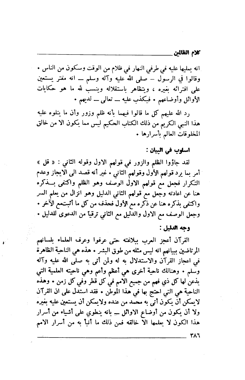 القرآن أعجز العرب ببلاغته حتى عرفوا وعرف العلماء بلسانهم المرتاضين ببيانهم أنه ليس مثله من طوق البشر. هذه هي الناحية الظاهرة في إعجاز القرآن والإستدلال به له ولمن أتى به صلى الله عليه وآله وسلم. وهنالك ناحية أخرى هي أعظم وأعم وهي ناحيته العلمية التي يذعن لها كل ذي فهم من جميع الأمم في كل قطر وفي كل زمن. وهذه الناحية هي التي احتج بها في هذا الموطن. فقد استدل على أن القرآن لا يمكن أن يكون أتى به محمد من عنده ولا يمكن أن يستعين عليه بغيره ولا أن يكون من أوضاع الأوائل- بأنه ينطوي على أشياء من أسرار هذا الكون لا يعلمها إلا خالقه فمن ذلك ما أنبأ به من أسرار الأمم
