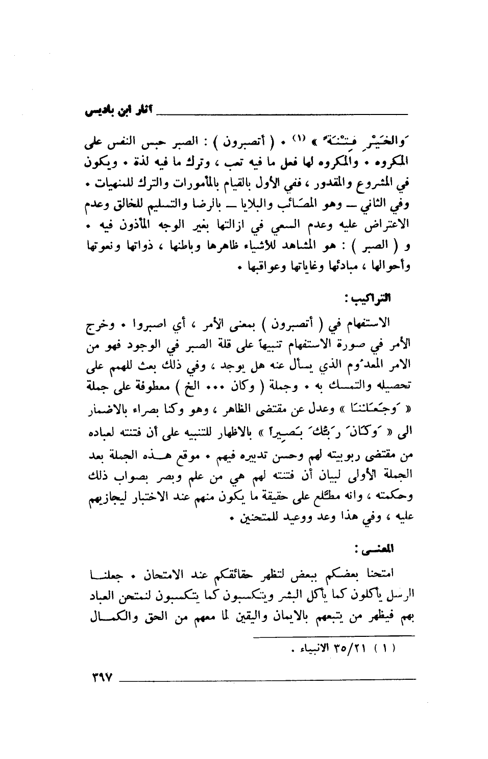 وَالْخَيْرِ فِتْنَةً} (1). (أتصبرون): الصبر حبس النفس على المكروه. والمكروه لها فعل ما فيه تعب، وترك ما فيه لذة. ويكون في المشروع والمقدور، ففي الأول بالقيام بالمأمورات والترك للمنهيات. وفي الثاني- وهو المصَائب والبلايا- بالرضا والتسليم للخالق وعدم الاعتراض عليه وعدم السعي في إزالتها بغير الوجه المأذون فيه. و (الصبر): هو المشاهد للأشياء ظاهرها وباطنها، ذواتها ونعوتها وأحوالها، مبادئها وغاياتها وعواقبها.