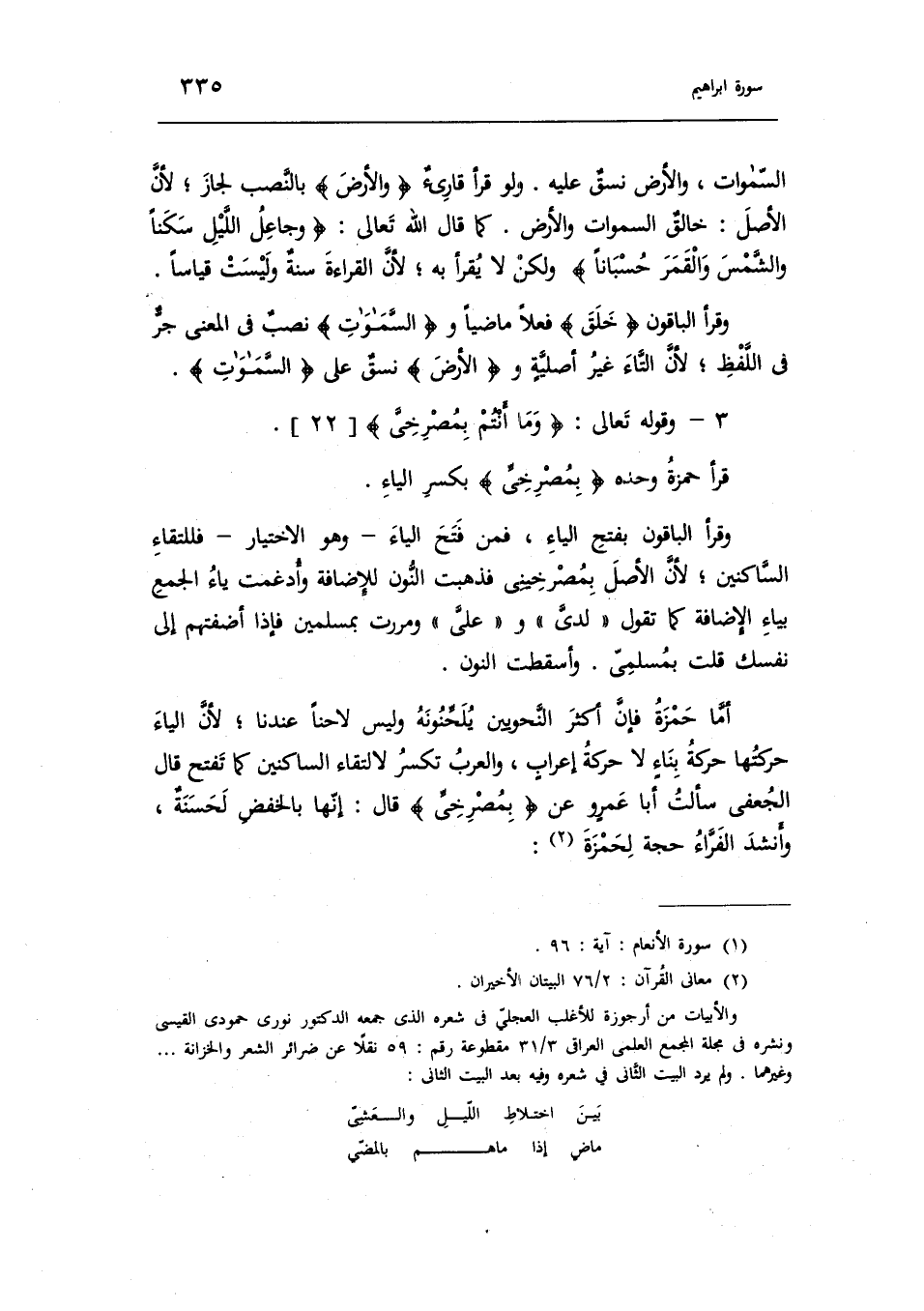 أمّا حمزة فإنّ أكثر النّحويين يلحّنونه وليس لاحنا عندنا؛ لأنّ الياء حركتها حركة بناء لا حركة إعراب، والعرب تكسر لالتقاء الساكنين كما تفتح قال الجعفى سألت أبا عمرو عن «بمصرخىِّ» قال: إنّها بالخفض لحسنة، وأنشد الفرّاء حجة لحمزة (¬٢):