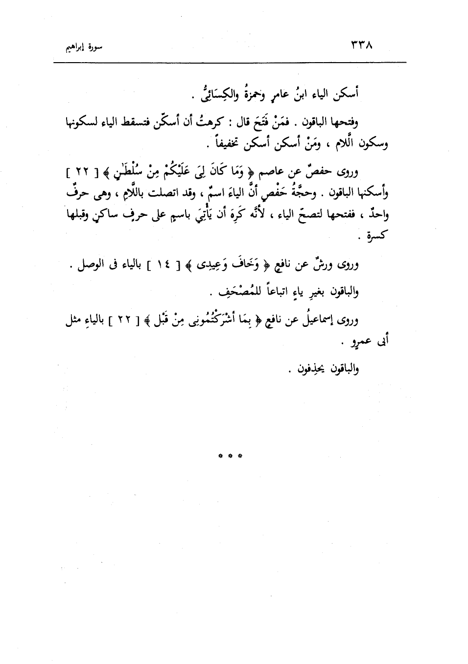 وروى حفص عن عاصم {وَما كانَ لِي عَلَيْكُمْ مِنْ سُلْطانٍ} [٢٢] وأسكنها الباقون. وحجّة حفص أنّ الياء اسم، وقد اتصلت باللاّم، وهى حرف واحد، ففتحها لتصحّ الياء، لأنّه كره أن يأتي باسم على حرف ساكن وقبلها كسرة.