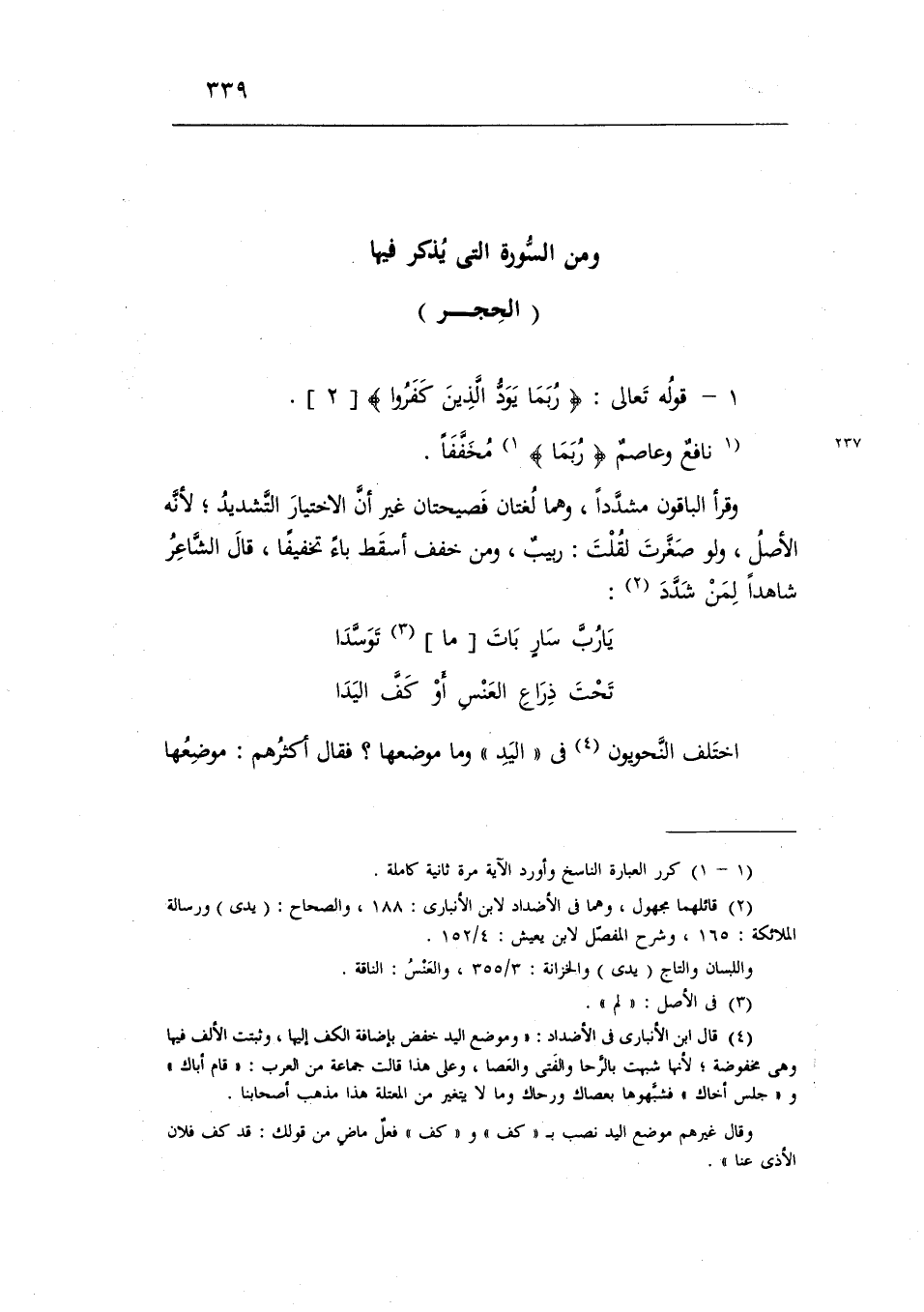 (¬٤) قال ابن الأنبارى فى الأضداد: «وموضع اليد خفض بإضافة الكف إليها، وثبتت الألف فيها وهى مخفوضة؛ لأنها شبهت بالرّحا والفتى والعصا، وعلى هذا قالت جماعة من العرب: «قام أباك» و «جلس أخاك» فشبّهوها بعصاك ورحاك وما لا يتغير من المعتلة هذا مذهب أصحابنا.