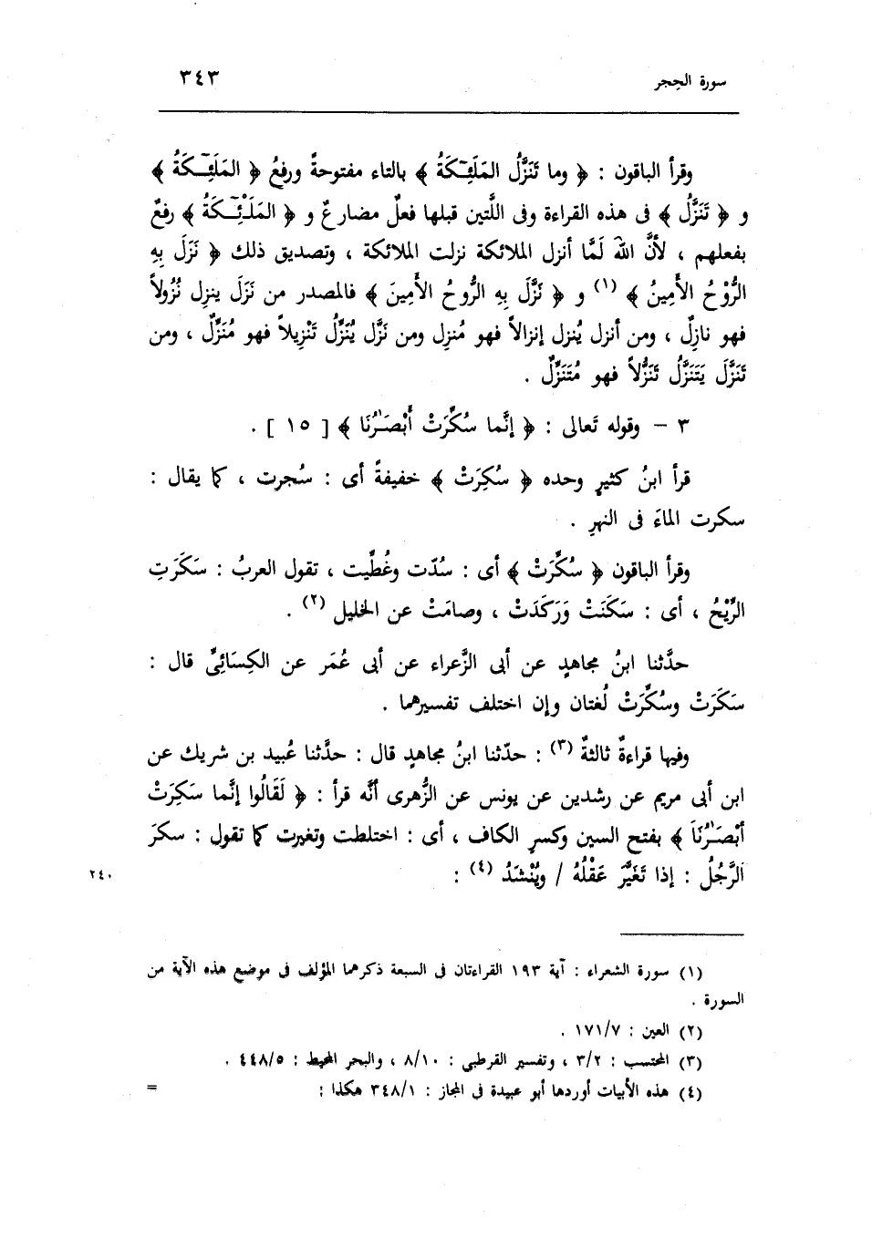 وفيها قراءة ثالثة (¬٣): حدّثنا ابن مجاهد قال: حدّثنا عبيد بن شريك عن ابن أبى مريم عن رشدين عن يونس عن الزّهرى أنّه قرأ: «لقالوا إنّما سَكِرَت أبصارنا» بفتح السين وكسر الكاف، أى: اختلطت وتغيرت كما تقول: سكر الرّجل: إذا تغيّر عقله/وينشد (¬٤):