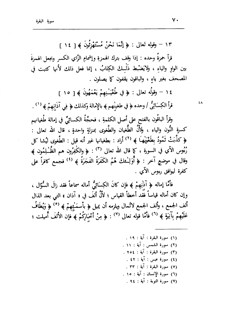 ١٣ - وقوله تعالى: {إِنَّما نَحْنُ مُسْتَهْزِؤُنَ} [١٤] قرأ حمزة وحده: إذا وقف بترك الهمزة وإشمام الزّاي الكسر وبجعل الهمزة بين الواو والياء، ولا يضبط ذلك الكتاب، إنما فعل ذلك لأنها كتبت في المصحف بغير ياء، والباقون يقفون كما يصلون.