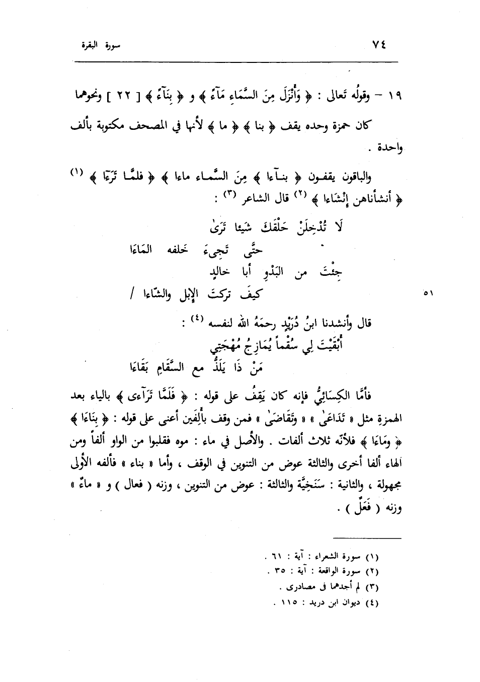 ١٩ - وقوله تعالى: {وَأَنْزَلَ مِنَ السَّماءِ ماءً} و {بِناءً} [٢٢] ونحوهما كان حمزة وحده يقف (بنا) (ما) لأنها في المصحف مكتوبة بألف واحدة.