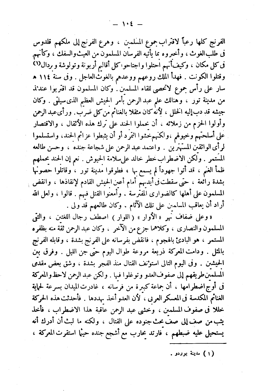 الفرنج كلها رعباً لاقتراب جموع المسلمين، وهرع الفرنج إلى ملكهم قلدوس في طلب الغوث، وأخبروه بما يأتيه الفرسان المسلمون من العيث والسفك، وكأنهم في كل مكان، وكيف أنهم أحتلوا واجتاحوا كل أقاليم أربونة وتولوشة وبردال (¬1) وقتلوا الكونت. فهدأ الملك روعهم ووعدهم بالغوث العاجل. وفي سنة 114هـ سار على رأس جموع لاتحصى للقاء المسلمين. وكان المسلمون قد اقتربوا عندئذ من مدينة تور، وهنالك علم عبد الرحمن بأمر الجيش العظيم الذي سيلقى. وكان جيشه قد دب إليه الخلل، لأنه كان مثقلا بالغنائم من كل ضرب. ورأى عبد الرحمن وأولوا الحزم من زملائه, أن يحملوا الجند على ترك هذه الأثقال، والاقتصار على أسلحتهم وخيولهم، ولكن خشوا التمرد أو أن يثبطوا عزائم الجند، واستسلموا لرأي الواثقين المستهترين. واعتمد عبد الرحمن على شجاعة جنده، وحسن طالعه المستمر. ولكن الأضطراب خطر خالد على سلامة الجيوش. نعم إن الجند يحملهم ظمأ الغنم، قد أتوا جهوداً لم يسمع بها، فطوقوا مدينة تور، وقاتلوا حصونها بشدة رائعة، حتى سقطت في أيديهم أمام أعين الجيش القادم لإنقاذها، وانقض المسلمون على أهلها كالضواري المفترسة، وأمعنوا القتل فيهم. قالوا، ولعل الله أراد أن يعاقب المسلمين على تلك الآثام، وكان طالعهم قد ولى.