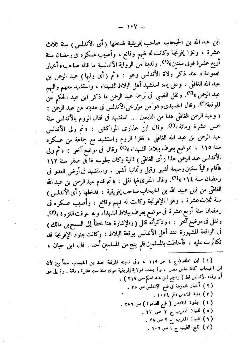 (¬1) ابن خلدون ج 4 ص 119، وفي نسبته الموقعة لمحمد بن الحبحاب خطأ بين لأن ابن الحبحاب كان عامل مصر، ولم يندب لولاية إفريقية سوى سنة عشرة ومائة. ولم يل هو أو ولده الأندلس قط (راجع ابن عبد الحكم ص 217).
