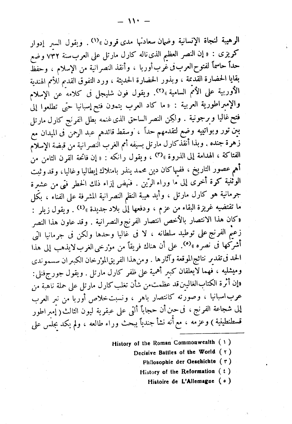 الرهيبة لنجاة الإنسانية وضمان سعادتها مدى قرون " (¬1). ويقول السير إدوار كريزي: " إن النصر العظيم الذي ناله كارل مارتل على العرب سنة 732 وضع حدا حاسما لفتوح العرب في غرب أوربا، وأنقذ النصرانية من الإسلام، وحفظ بقايا الحضارة القديمة، وبذور الحضارة الحديثة، ورد التفوق القديم للأمم الهندية الأوربية على الأمم السامية " (¬2). ويقول فون شليجل في كلامه عن الإسلام والإمبراطورية العربية: " ما كاد العرب يتمون فتح إسبانيا حتى تطلعوا إلى فتح غاليا وبرجونية. ولكن النصر الساحق الذي غنمه بطل الفرنج كارل مارتل بين تور وبواتييه وضع لتقدمهم حداً، وسقط قائدهم عبد الرحمن في الميدان مع زهرة جنده. وبذا أنقذ كارل مارتل بسيفه أمم الغرب النصرانية من قبضة الإسلام الفتاكة، الهدامة إلى الذروة " (¬3)، ويقول رانكه: " إن فاتحة القرن الثامن من أهم عصور التاريخ، ففيها كان دين محمد ينذر بامتلاك إيطاليا وغاليا، وقد وثبت الوثنية كرة أخرى إلى ما وراء الرّين فنهض إزاء ذلك الخطر فتى من عشيرة جرمانية هو كارل مارتل، وأيد هيبة النظم النصرانية المشرفة على الفناء، بكل ما تقتضيه غريزة البقاء من عزم، ودفعها إلى بلاد جديدة " (¬4). ويقول زيلر: " كان هذا الانتصار بالأخص انتصار الفرنج والنصرانية. وقد عاون هذا النصر زعيم الفرنج على توطيد سلطانه، لا في غاليا وحدها ولكن في جرمانيا التي أشركها في نصره " (¬5). على أن هناك فريقاً من مؤرخي الغرب لا يذهب إلى هذا الحد في تقدير نتائج الموقعة وآثارها. ومن هذا الفريق المؤرخان الكبيران سسموندي وميشليه، فهما لايعلقان كبير أهمية على ظفر كارل مارتل. ويقول جورج فنلي: " إن أثرة الكتاب الغاليين قد عظمت من شأن تغلب كارل مارتل على حملة ناهبة من عرب اسبانيا، وصورته كانتصار باهر، ونسبت خلاص أوربا من نير العرب إلى شجاعة الفرنج، في حين أن حجاباً ألقى على عبقرية ليون الثالث (إمبراطور قسطنطينية) وعزمه، مع أنه نشأ جنديا يبحث وراء طالعه، ولم يكد يجلس على