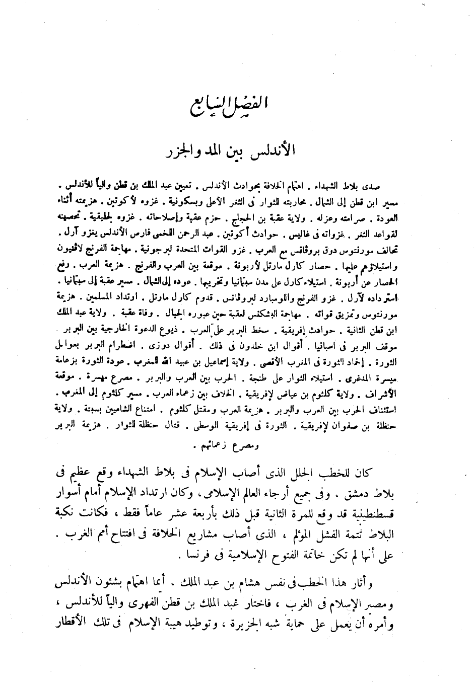 صدى بلاط الشهداء. اهتمام الخلافة بحوادث الأندلس. تعيين عبد الملك بن قطن واليا للأندلس. مسير ابن قطن إلى الشمال. محاربته للثوار في الثغر الأعلى وبسكونية. غزوه لأكوتين. هزيمته أثناء العودة. صرامته وعزله. ولاية عقبة بن الحجاج. حزم عقبة وإصلاحاته. غزوه لجليقية. تحصينه لقواعد الثغر. غزواته في غاليس. حوادث أكوتين. عبد الرحمن اللخمي فارس الأندلس يغزو آرل. تحالف مورنتوس دوق بروفانس مع العرب. غزو القوات المتحدة لبرجونية. مهاجمة الفرنج لأفنيون واستيلاؤهم عليها. حصار كارل مارتل لأربونة. موقعة بين العرب والفرنج. هزيمة العرب. رفع الحصار عن أربونة. استيلاء كارل على مدن سبتمانيا وتخريبها. عوده إلى الشمال. مسير عقبة إلى سبتمانيا. استرداده لآرل. غزو الفرنج واللومبارد لبروفانس. قدوم كارل مارتل. ارتداد المسلمين. هزيمة مورنتوس وتمزيق قواته. مهاجمة البشكنس لعقبة حين عبوره الجبال. وفاة عقبة. ولاية عبد الملك ابن قطن الثانية. حوادث إفريقية. سخط البربر على العرب. ذيوع الدعوة الخارجية بين البربر. موقف البربر في اسبانيا. أقوال ابن خلدون في ذلك. أقوال دوزي. اضطرام البربر بعوامل الثورة. إخماد الثورة في المغرب الأقصى. ولاية إسماعيل بن عبيد الله للمغرب. عودة الثورة بزعامة ميسرة المدغري. استيلاء الثوار على طنجة. الحرب بين العرب والبربر. مصرع ميسرة. موقعة الأشراف. ولاية كلثوم بن عياض لإفريقية. الخلاف بين زعماء العرب. مسير كلثوم إلى المغرب. استئناف الحرب بين العرب والبربر. هزيمة العرب ومقتل كلثوم. امتناع الشاميين بسبتة. ولاية حنظلة بن صفوان لإفريقية. الثورة في إفريقية الوسطى. قتال حنظلة للثوار. هزيمة البربر ومصرع زعمائهم.