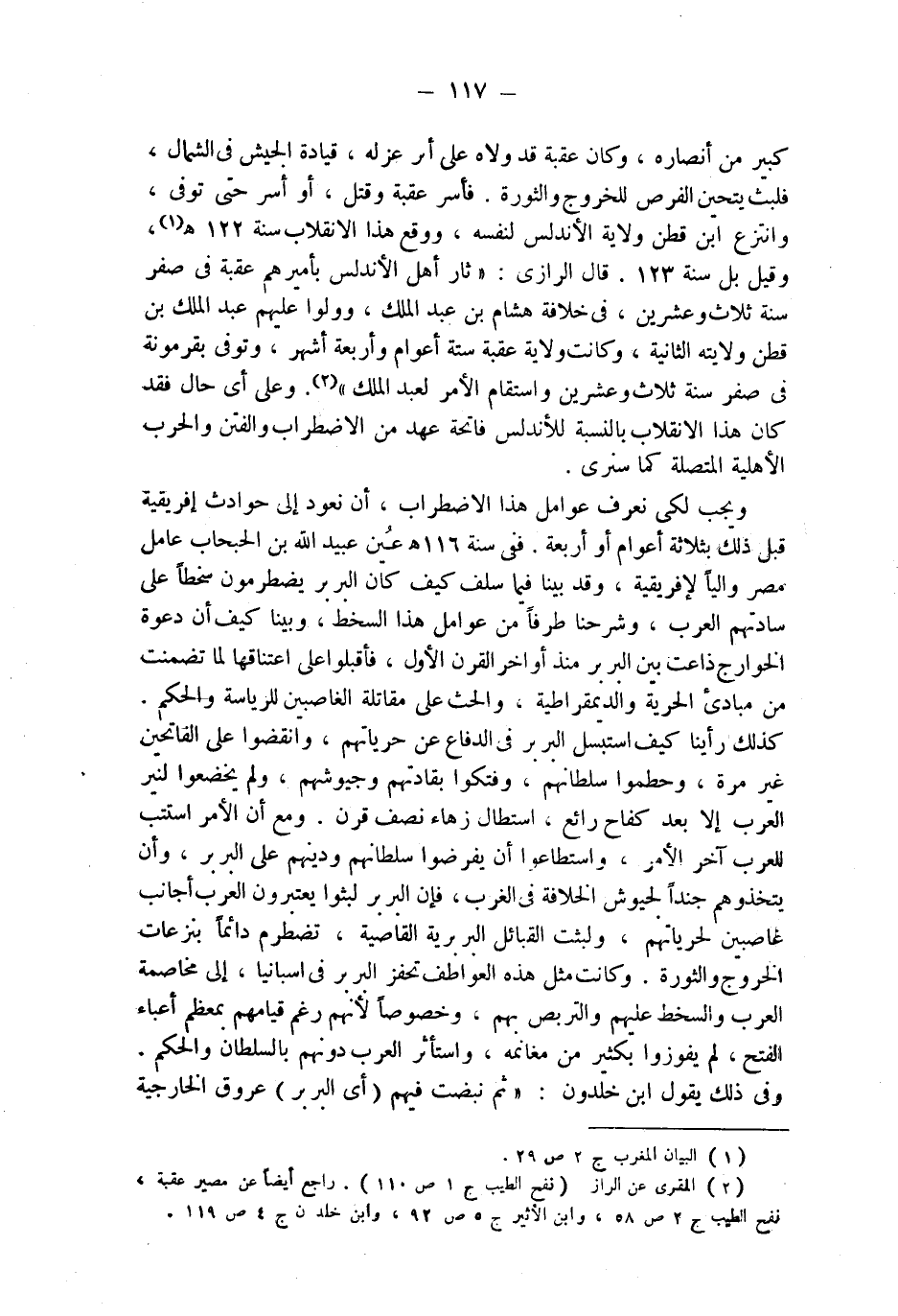 (¬2) المقري عن الرازي (نفح الطيب ج 1 ص 110). راجع أيضا عن مصير عقبة، نفح الطيب ج 2 ص 58، وابن الأثير ج 5 ص 92، وابن خلدون ج 4 ص 119.