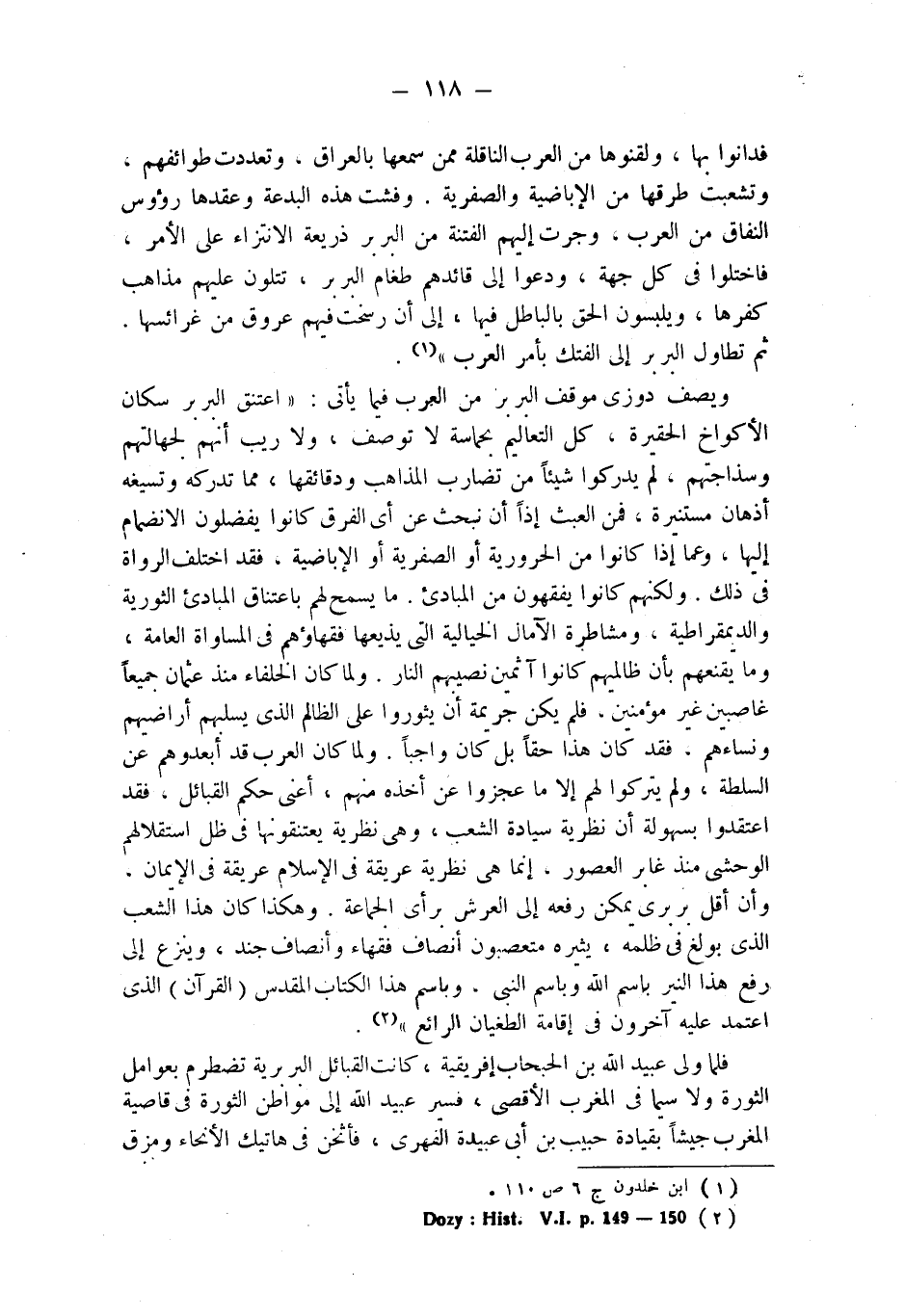 ويصف دوزي موقف البربر من العرب فيما يأتي: " اعتنق البربر سكان الأكواخ الحقيرة، كل التعاليم بحماسة لا توصف، ولا ريب أنهم لجهالتهم وسذاجتهم، لم يدركوا شيئاً من تضارب المذاهب ودقائقها، مما تدركه وتسيغه أذهان مستنيرة، فمن العبث إذاً أن نبحث عن أي الفرق كانوا يفضلون الانضمام إليها، وعما إذا كانوا من الحرورية أو الصفرية أو الإباضية، فقد اختلف الرواة في ذلك. ولكنهم كانوا يفقهون من المبادئ. ما يسمح لهم باعتناق المبادئ الثورية والديمقراطية، ومشاطرة الآمال الخيالية التي يذيعها فقهاؤهم في المساواة العامة، وما يقنعهم بأن ظالميهم كانوا آثمين نصيبهم النار. ولما كان الخلفاء منذ عثمان جميعاً غاصبين غير مؤمنين، فلم يكن جريمة أن يثوروا على المظالم الذي يسلبهم أراضيهم ونساءهم. فقد كان هذا حقاً بل كان واجباً. ولما كان العرب قد أبعدوهم عن السلطة، ولم يتركوا لهم إلا ما عجزوا عن أخذه منهم، أعني حكم القبائل، فقد اعتقدوا بسهولة أن نظرية سيادة الشعب، وهي نظرية يعتنقونها في ظل استقلالهم الوحشي منذ غابر العصور، إنما هي نظرية عريقة في الإسلام عريقة في الإيمان. وأن أقل بربري يمكن رفعه إلى العرش برأي الجماعة. وهكذا كان هذا الشعب الذي بولغ في ظلمه، يثيره متعصبون أنصاف فقهاء وأنصاف جند، وينزع إلى رفع هذا النير باسم الله وباسم النبي، وباسم هذا الكتاب المقدس (القرآن) الذي اعتمد عليه آخرون في إقامة الطغيان الرائع " (¬2).