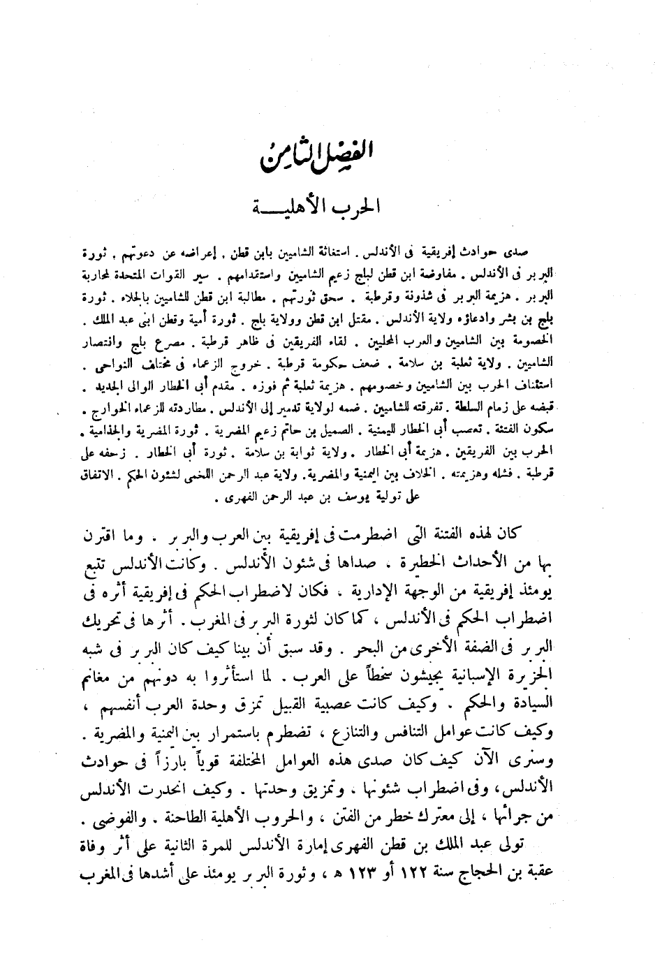 صدى حوادث إفريقية في الأندلس. استغاثة الشاميين بابن قطن. إعراضه عن دعوتهم. ثورة البربر في الأندلس. مفاوضة ابن قطن لبلج زعيم الشاميين واستقدامهم. سير القوات المتحدة لمحاربة البربر. هزيمة البربر في شذونة وقرطبة. سحق ثورتهم. مطالبة ابن قطن الشاميين بالجلاء. ثورة بلج بن بشر وادعاؤه ولاية الأندلس. مقتل ابن قطن وولاية بلج. ثورة أمية وقطن ابنى عبد الملك. الخصومة بين الشاميين والعرب المحليين. لقاء الفريقين في ظاهر قرطبة. مصرع بلج وانتصار الشاميين. ولاية ثعلبة بن سلامة. ضعف حكومة قرطبة. خروج الزعماء في مختلف النواحي. استئناف الحرب بين الشاميين وخصومهم. هزيمة ثعلبة ثم فوزه. مقدم أبي الخطار الوالي الجديد. قبضه على زمام السلطة. تفرقته للشاميين. ضمه لولاية تدمير إلى الأندلس. مطاردته للزعماء الخوارج. سكون الفتنة. تعصب أبي الخطار لليمنية. الصميل بن حاتم زعيم المضرية. ثورة المضرية والجذامية. الحرب بين الفريقين. هزيمة أبي الخطار. ولاية ثوابة بن سلامة. ثورة أبي الخطار. زحفه على قرطبة. فشله وهزيمته. الخلاف بين اليمنية والمضرية. ولاية عبد الرحمن اللخمي لشئون الحكم. الاتفاق على تولية يوسف بن عبد الرحمن الفهري.