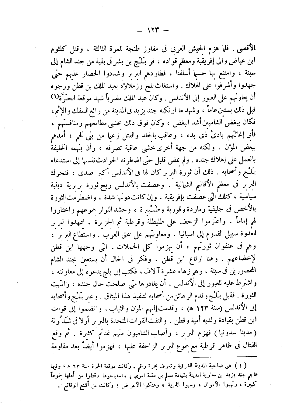 الأقصى. فلما هزم الجيش العربي في مفاوز طنجة للمرة الثالثة، وقتل كلثوم ابن عياض والي إفريقية ومعظم قواده، فر بَلْج بن بشر في بقية من جند الشام إلى سبتة، وامتنع بها حسبما أسلفنا، فطاردهم البربر وشددوا الحصار عليهم حتى جهدوا وأشرفوا على الهلاك. واستغاث بلج وزملاؤه بعبد الملك بن قطن ورجوه أن يعاونهم على العبور إلى الأندلس. وكان عبد الملك مضريا شهد موقعة الحَرَّة (¬1) قبل ذلك بستين عاماً، وشهد ما ارتكبه جند يزيد في المدينة من رائع السفك والإثم، فكان يبغض الشاميين أشد البغض، وكان فوق ذلك يخشى مطامعهم ومنافستهم، فأبى إغاثتهم بادىء ذى بدء، وعاقب بالجلد والقتل زعيما من بني لخم، أمدهم ببعض المؤن، ولكنه من جهة أخرى خشي عاقبة تصرفه، وأن يتهمه الخليفة بالعمل على إهلاك جنده. ولم يمض قليل حتى اضطرته الحوادث نفسها إلى استدعاء بَلْج وأصحابه. ذلك أن ثورة البربر كان لها في الأندلس أكبر صدى، فتحرك البربر في معظم الأقاليم الشمالية. وعصفت بالأندلس ريح ثورة بربرية دينية سياسية، كتلك التي عصفت بإفريقية، وإن كانت دونها شدة، واضطرمت الثورة بالأخص في جليقية وماردة وقورية وطَلْبيرة، وحشد الثوار جموعهم واختاروا لهم إماما، واعتزموا الزحف على طليطلة وقرطبة ثم الجزيرة، ليمهدوا لبربر العدوة سبيل القدوم إلى اسبانيا، ومعاونتهم على سحق العرب. واستطاع البربر، وهم في عنفوان ثورتهم، أن يهزموا كل الحملات، التي وجهها ابن قطن لإخضاعهم. وهنا ارتاع ابن قطن، وفكر في الحال أن يستعين بجند الشام المحصورين في سبتة، وهم زهاء عشرة آلاف، فكتب إلى بلج يدعوه إلى معاونته، واشترط عليه للعبور إلى الأندلس، أن يغادرها متى صلحت حال جنده، وانتهت الثورة. فقبل بَلْج وقدم الرهائن من أصحابه لتنفيذ هذا الميثاق. وعبر بَلْج وأصحابه إلى الأندلس (سنة 123 هـ)، وقدمت إليهم المؤن والثياب. وانضموا إلى قوات ابن قطن بقيادة ولديه أمية وقطن. والتقت القوات المتحدة بالبربر أولا في شذُونة (مدينة سدونيا) فهزم البربر، وأصاب الشاميون منهم غنائم كثيرة. ثم وقع القتال في ظاهر قرطبة مع جموع البربر الزاحفة عليها، فهزموا أيضا بعد مقاومة