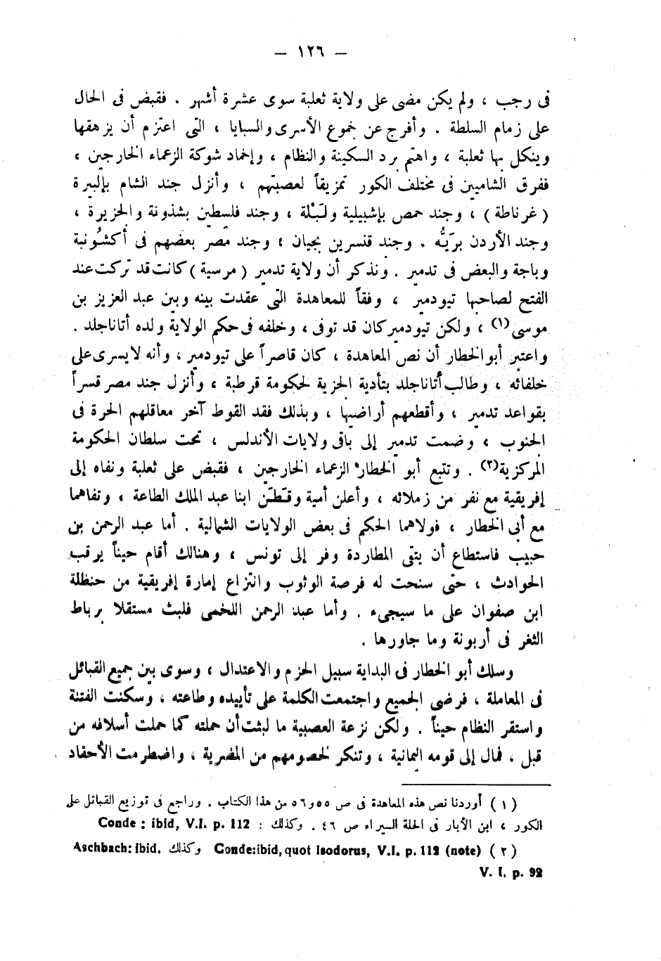 (¬1) أوردنا نص هذه المعاهدة في ص 55 و56 من هذا الكتاب. وراجع في توزيع القبائل على الكور، ابن الأبار في الحلة السيراء ص 46. وكذلك: Conde: ibid, V.I. P. 112.