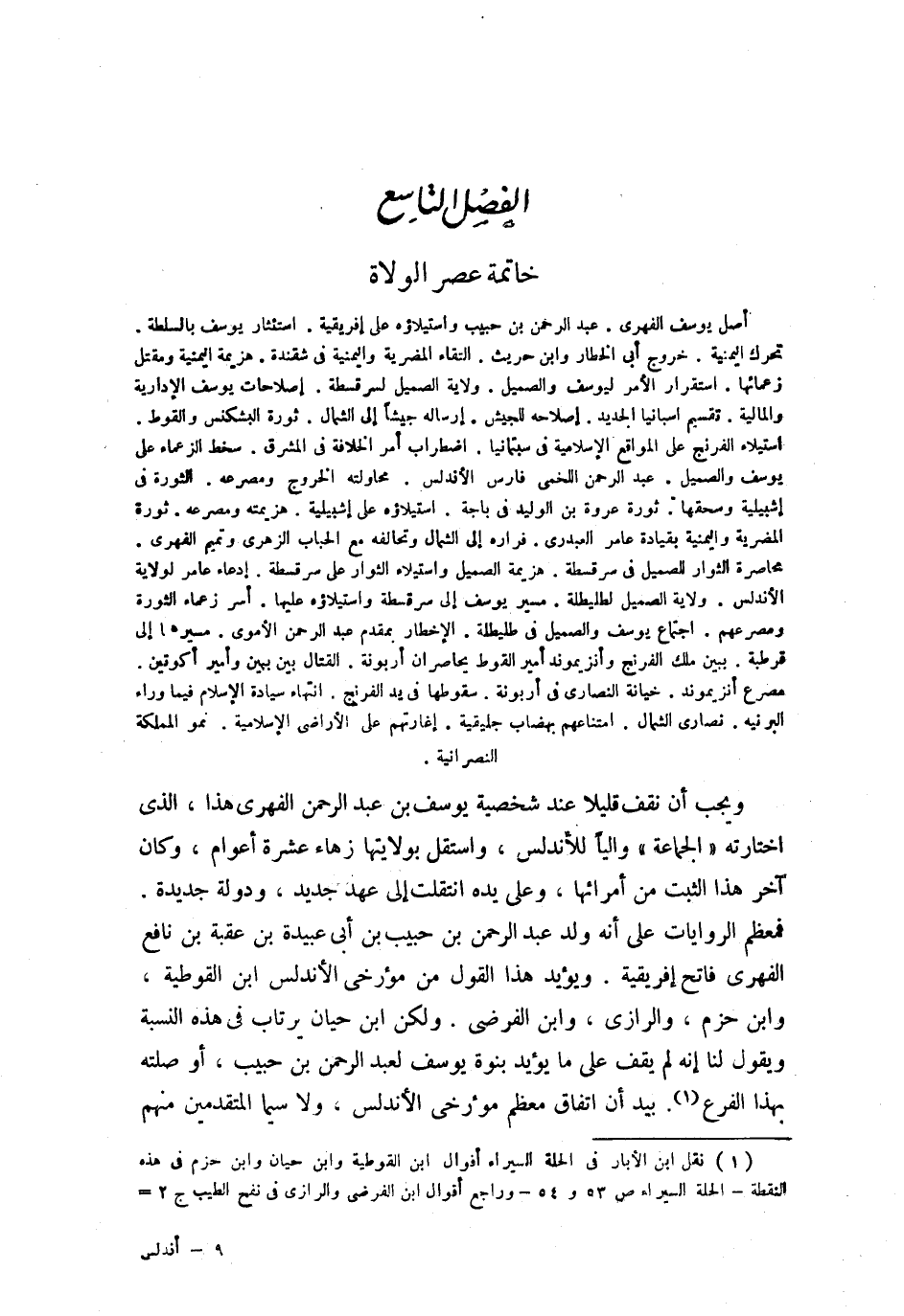 ْأصل يوسف الفهري. عبد الرحمن بن حبيب واستيلاؤه على إفريقية. استئثار يوسف بالسلطة. تحرك اليمنية. خروج أبي الخطار وابن حريث. التقاء المضرية واليمنية في شقندة. هزيمة اليمنية ومقتل زعمائها. استقرار الأمر ليوسف والصميل. ولاية الصميل لسرقسطة. إصلاحات يوسف الإدارية والمالية. تقسيم اسبانيا الجديد. إصلاحه للجيش. إرساله جيشا إلى الشمال. ثورة البشكنس والقوط. استيلاء الفرنج على المواقع الإسلامية في سبتمانيا. اضطراب أمر الخلافة في المشرق. سخط الزعماء على يوسف والصميل. عبد الرحمن اللخمي فارس الأندلس. محاولته الخروج ومصرعه. الثورة في إشبيلية وسحقها. ثورة عروة بن الوليد في باجة. استيلاؤه على إشبيلية. هزيمته ومصرعه. ثورة المضرية واليمنية بقيادة عامر العبدري. فراره إلى الشمال وتحالفه مع الحباب الزهري وتميم الفهري. محاصرة الثوار الصميل في سرقسطة. هزيمة الصميل واستيلاء الثوار على سرقسطة. إدعاء عامر لولاية الأندلس. ولاية الصميل لطليطلة. مسير يوسف إلى سرقسطة واستيلاؤه عليها. أسر زعماء الثورة ومصرعهم. اجتماع يوسف والصميل في طليطلة الإخطار بمقدم عبد الرحمن الأموي. مسيره إلى قرطبة. ببين ملك الفرنج وأنزيموند أمير القوط يحاصران أربونة. القتال بين ببين وأمير أكوتين. مصرع أنزيموند. خيانة النصارى في أربونة. سقوطها في يد الفرنج. انتهاء سيادة الإسلام فيما وراء البرنيه. نصارى الشمال. امتناعهم بهضاب جليقية. إغارتهم على الأراضي الإسلامية. نمو المملكة النصرانية.