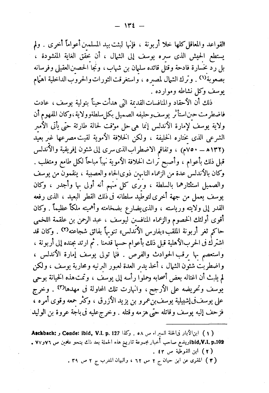 القواعد والمعاقل كلها خلا أربونة، فإنها لبثت بيد المسلمين أعواماً أخرى. ولم يستطع الجيش الذي سيره يوسف إلى الشمال، أن يحقق الغاية المنشودة، بل رد بخسارة فادحة وقتل قائده سليمان بن شهاب، ونجا الحصين العقيلي وفرسانه بصعوبة (¬1). وترك الشمال لمصيره، واستغرقت الثورات والحروب الداخلية اهتمام يوسف وكل نشاطه وموارده.