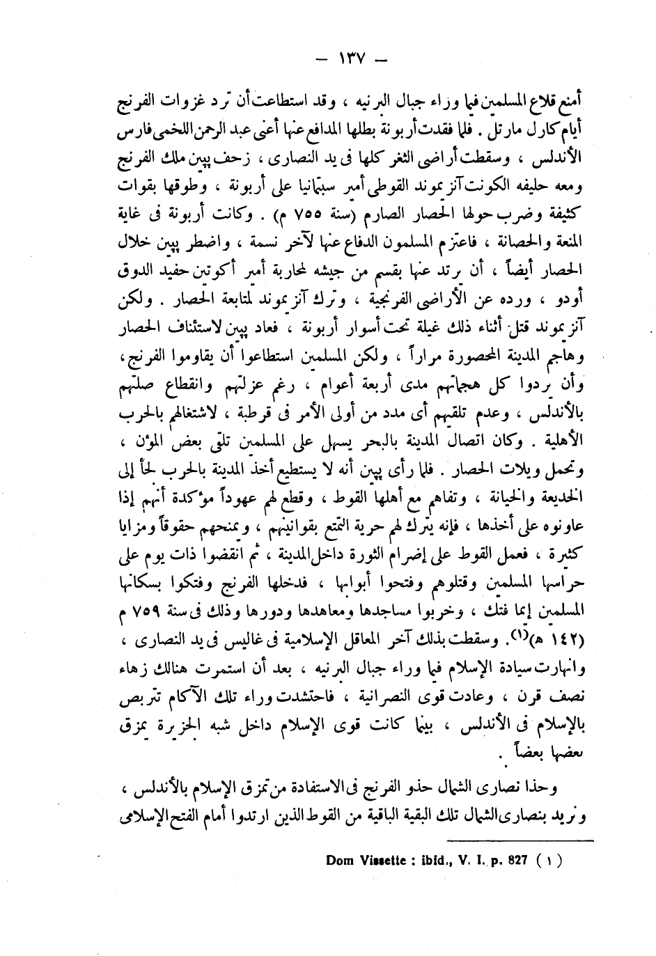 أمنع قلاع المسلمين فيما وراء جبال البرنيه، وقد استطاعت أن ترد غزوات الفرنج أيام كارل مارتل. فلما فقدت أربونة بطلها المدافع عنها أعني عبد الرحمن اللخمي فارس الأندلس، وسقطت أراضي الثغر كلها في يد النصارى، زحف ببين ملك الفرنج ومعه حليفه الكونت آنزيموند القوطي أمير سبتمانيا على أربونة، وطوقها بقوات كثيفة وضرب حولها الحصار الصارم (سنة 755 م). وكانت أربونة في غاية المنعة والحصانة، فاعتزم المسلمون الدفاع عنها لآخر نسمة، واضطر ببين خلال الحصار أيضاً، أن يرتد عنها بقسم من جيشه لمحاربة أمير أكوتين حفيد الدوق أودو، ورده عن الأراضي الفرنجية، وترك آنزيموند لمتابعة الحصار. ولكن آنزيموند قتل أثناء ذلك غيلة تحت أسوار أربونة، فعاد ببين لاستئناف الحصار وهاجم المدينة المحصورة مراراً، ولكن المسلمين استطاعوا أن يقاوموا الفرنج، ْوأن يردوا كل هجماتهم مدى أربعة أعوام، رغم عزلتهم وانقطاع صلتهم بالأندلس، وعدم تلقيهم أى مدد من أولى الأمر في قرطبة، لاشتغالهم بالحرب الأهلية. وكان اتصال المدينة بالبحر يسهل على المسلمين تلقى بعض المؤن، وتحمل ويلات الحصار. فلما رأى ببين أنه لا يستطيع أخذ المدينة بالحرب لجأ إلى الخديعة والخيانة، وتفاهم مع أهلها القوط، وقطع لهم عهوداً مؤكدة أنهم إذا عاونوه على أخذها، فإنه يترك لهم حرية التمتع بقوانينهم، ويمنحهم حقوقاً ومزايا كثيرة، فعمل القوط على إضرام الثورة داخل المدينة، ثم انقضوا ذات يوم على حراسها المسلمين وقتلوهم وفتحوا أبوابها، فدخلها الفرنج وفتكوا بسكانها المسلمين أيما فتك، وخربوا مساجدها ومعاهدها ودورها وذلك في سنة 759 م (142هـ) (¬1). وسقطت بذلك آخر المعاقل الإسلامية في غاليس في يد النصارى، وانهارت سيادة الإسلام فيما وراء جبال البرنيه، بعد أن استمرت هنالك زهاء نصف قرن، وعادت قوى النصرانية، فاحتشدت وراء تلك الآكام تتربص بالإسلام في الأندلس، بينما كانت قوى الإسلام داخل شبه الجزيرة يمزق بعضها بعضا.