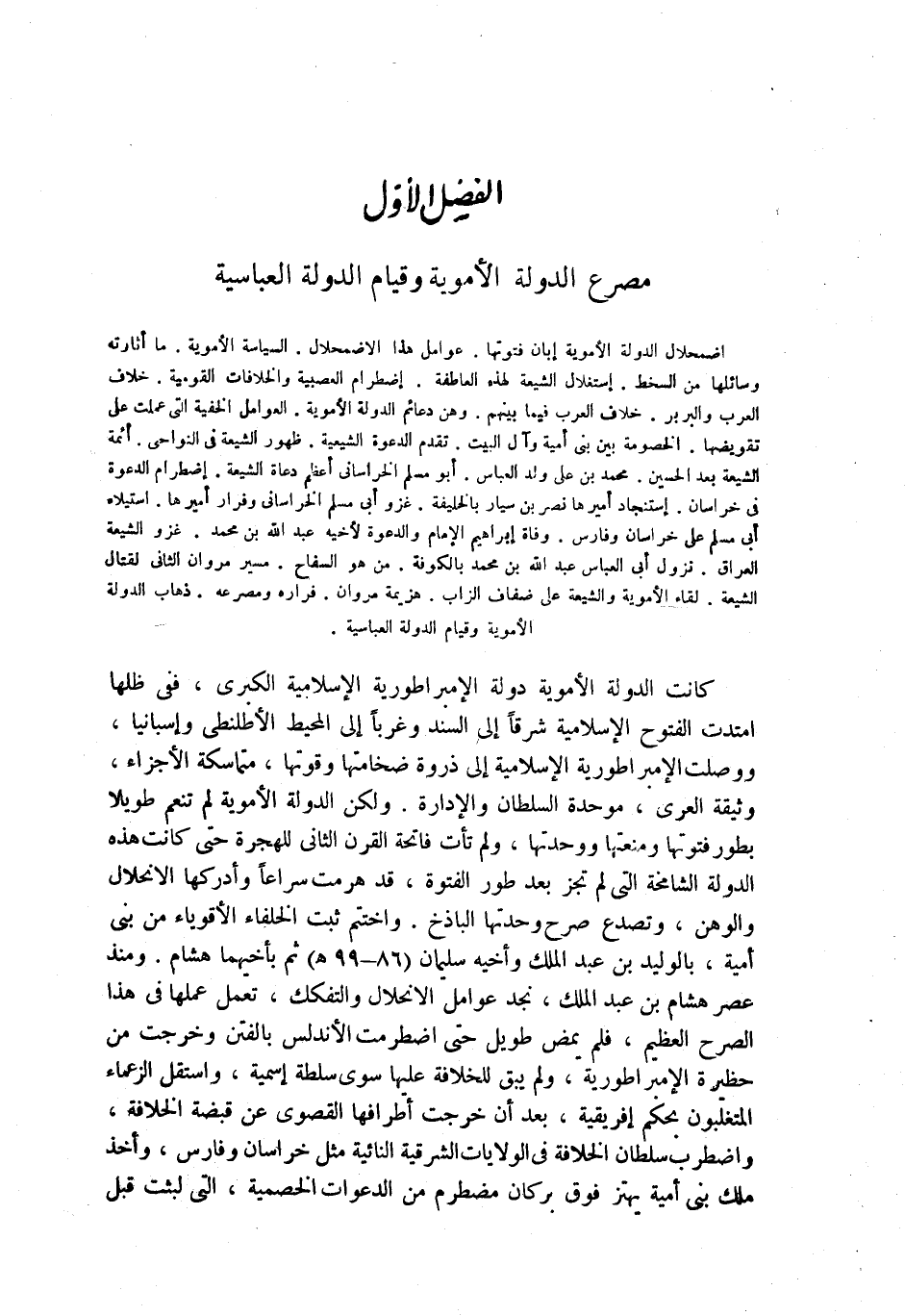 اضمحلال الدولة الأموية إبان فتوتها. عوامل هذا الاضمحلال. السياسة الأموية. ما أثارته وسائلها من السخط. استغلال الشيعة لهذه العاطفة. اضطرام العصبية والخلافات القومية. خلاف العرب والبربر. خلاف العرب فيما بينهم. وهن دعائم الدولة الأموية. العوامل الخفية التي عملت على تقويضها. الخصومة بين بني أمية وآل البيت. تقدم الدعوة الشيعية. ظهور الشيعة في النواحي. أئمة الشيعة بعد الحسين. محمد بن علي ولد العباس. أبو مسلم الخراساني أعظم دعاة الشيعة. إضطرام الدعوة في خراسان. إستنجاد أميرها نصر بن سيار بالخليفة. غزو أبي مسلم الخراساني وفرار أميرها. استيلاء أبى مسلم على خراسان وفارس. وفاة إبراهيم الإمام والدعوة لأخيه عبد الله بن محمد. غزو الشيعة العراق. نزول أبي العباس عبد الله بن محمد بالكوفة. من هو السفاح. مسير مروان الثاني لقتال الشيعة. لقاء الأموية والشيعة على ضفاف الزاب. هزيمة مروان. فراره ومصرعه. ذهاب الدولة الأموية وقيام الدولة العباسية.