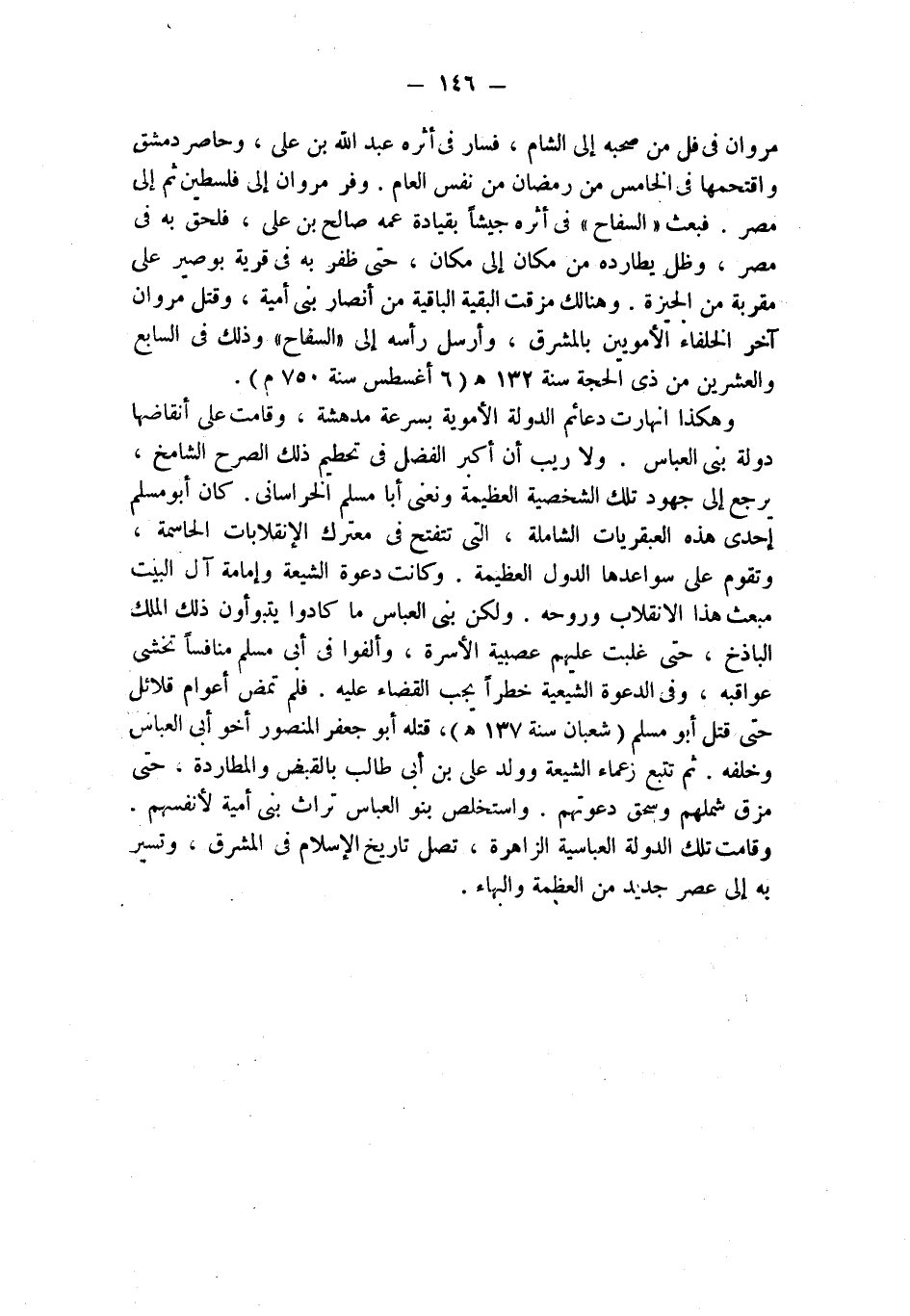 وهكذا انهارت دعائم الدولة الأموية بسرعة مدهشة، وقامت على أنقاضها دولة بني العباس. ولا ريب أن أكبر الفضل في تحطيم ذلك الصرح الشامخ، يرجع إلى جهود تلك الشخصية العظيمة ونعني أبا مسلم الخراساني. كان أبو مسلم إحدى هذه العبقريات الشاملة، التي تتفتح في معترك الإنقلابات الحاسمة، وتقوم على سواعدها الدول العظيمة. وكانت دعوة الشيعة وإمامة آل البيت مبعث هذا الانقلاب وروحه. ولكن بني العباس ما كادوا يتبوأون ذلك الملك الباذخ، حتى غلبت عليهم عصبية الأسرة، وألفوا في أبي مسلم منافساً تخشى عواقبه، وفي الدعوة الشيعية خطراً يجب القضاء عليه. فلم تمض أعوام قلائل حتى قتل أبو مسلم (شعبان سنة 137هـ)، قتله أبو جعفر المنصور أخو أبي العباس وخلفه. ثم تتبع زعماء الشيعة وولد علي بن أبي طالب بالقبض والمطاردة، حتى مزق شملهم وسحق دعوتهم. واستخلص بنو العباس تراث بني أمية لأنفسهم. وقامت تلك الدولة العباسية الزاهرة، تصل تاريخ الإسلام في المشرق، وتسير به إلى عصر جديد من العظمة والبهاء.