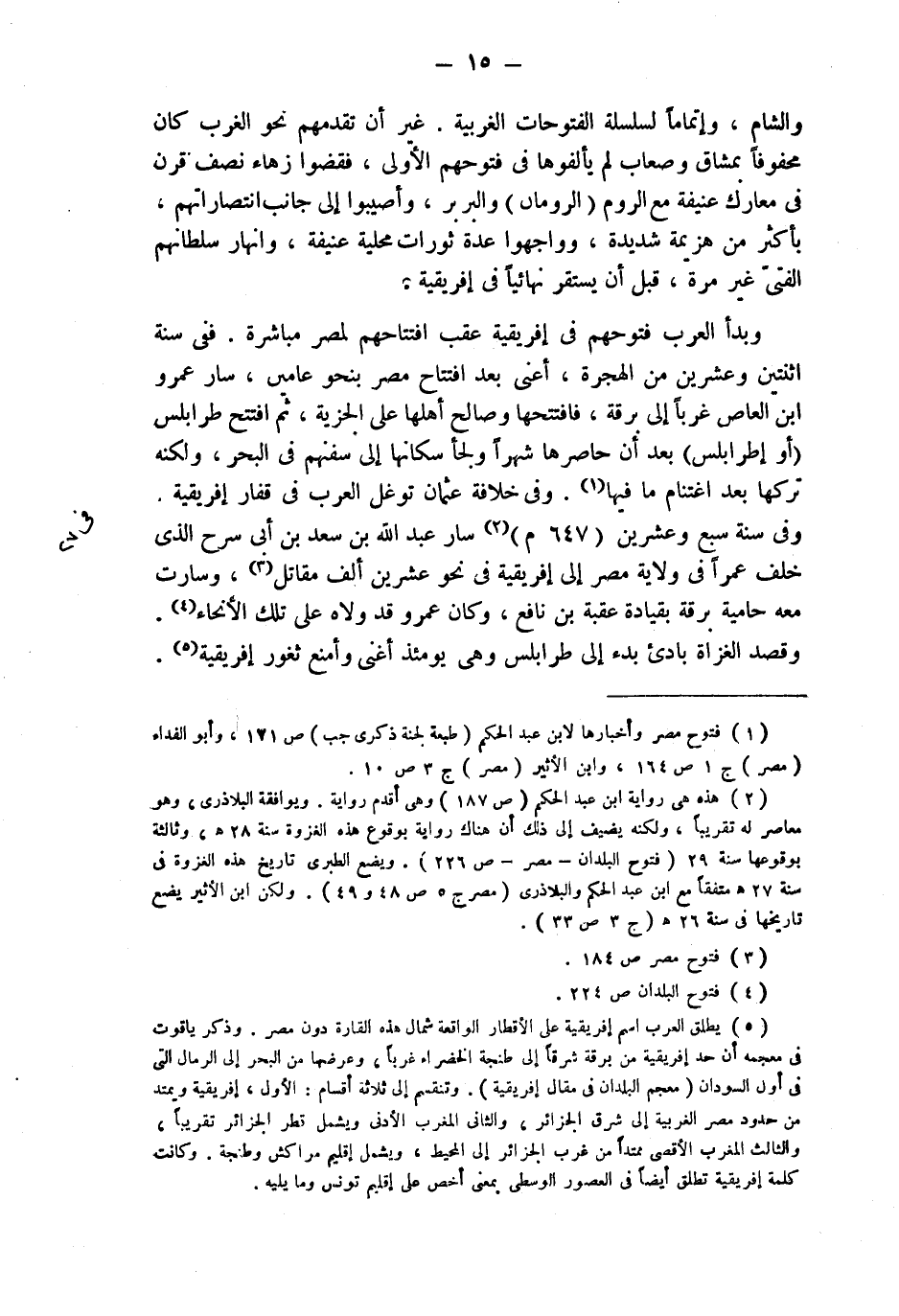 (¬5) يطلق العرب اسم إفريقية على الأقطار الواقعة شمال هذه القارة دون مصر. وذكر ياقوت في معجمه أن حد إفريقية من برقة شرقا إلى طنجة الخضراء غرباً، وعرضها من البحر إلى الرمال التي في أول السودان (معجم البلدان في مقال إفريقية). وتنقسم إلى ثلاثة أقسام: الأول، إفريقية ويمتد من حدود مصر الغربية إلى شرق الجزائر، والثاني المغرب الأدنى ويشمل قطر الجزائر تقريبا، والثالث المغرب الأقصى ممتدا من غرب الجزائر إلى المحيط، ويشمل إقليم مراكش وطنجة. وكانت كلمة إفريقية تطلق أيضا في العصور الوسطى بمعنى أخص على إقليم تونس وما يليه.