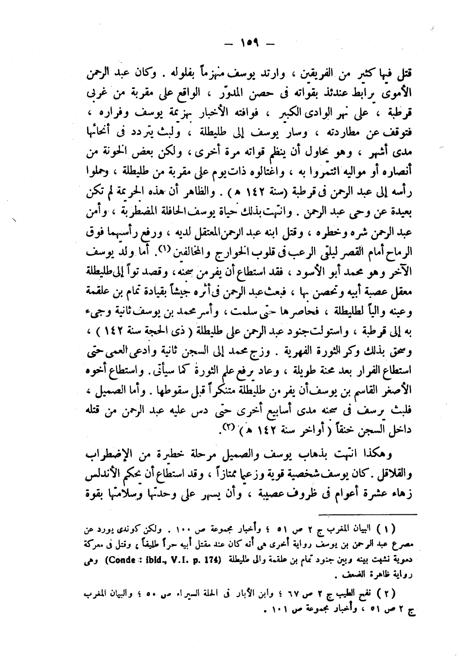 (¬1) البيان المغرب ج 2 ص 51؛ وأخبار مجموعة ص 100. ولكن كوندي يورد عن مصرع عبد الرحمن بن يوسف رواية أخرى هي أنه كان عند مقتل أبيه حرا طليقا، وقتل في معركة دموية نشبت بينه وبين جنود تمام بن علقمة والي طليطلة ( Conde: ibid, V.I.p. 174) وهي رواية ظاهرة الضعف.