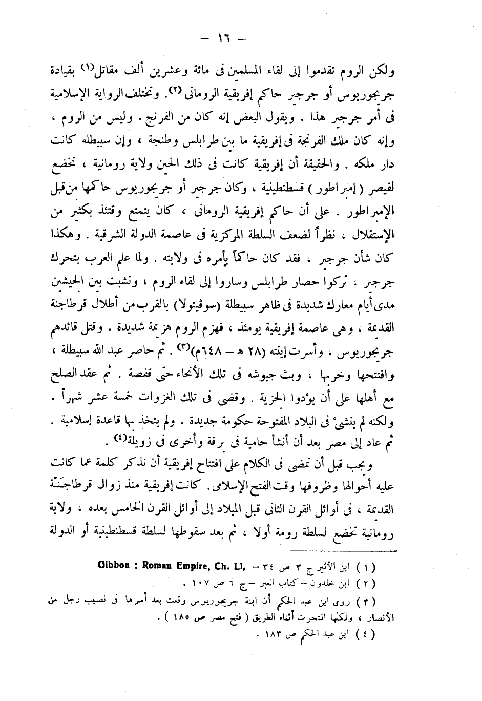 ولكن الروم تقدموا إلى لقاء المسلمين في مائة وعشرين ألف مقاتل (¬1) بقيادة جريجوريوس أو جرجير حاكم إفريقية الروماني (¬2). وتختلف الرواية الإسلامية في أمر جرجير هذا، ويقول البعض إنه كان من الفرنج وليس من الروم، وإنه كان ملك الفرنجة في إفريقية ما بين طرابلس وطنجة، وإن سبيطله كانت دار ملكه. والحقيقة أن إفريقية كانت في ذلك الحين ولاية رومانية، تخضع لقيصر (إمبراطور) قسطنطينية، وكان جرجير أو جريجوريوس حاكمها من قبل الإمبراطور. على أن حاكم إفريقية الروماني، كان يتمتع وقتئذ بكثير من الإستقلال، نظراً لضعف السلطة المركزية في عاصمة الدولة الشرقية. وهكذا كان شأن جرجير، فقد كان حاكما بأمره في ولايته. ولما علم العرب بتحرك جرجير، تركوا حصار طرابلس وساروا إلى لقاء الروم، ونشبت بين الجيشين مدى أيام معارك شديدة في ظاهر سبيطلة (سوفيتولا) بالقرب من أطلال قرطاجنة القديمة، وهي عاصمة إفريقية يومئذ، فهزم الروم هزيمة شديدة، وقتل قائدهم جريجوريوس، وأسرت إبنته (28 هـ - 648 م) (¬3). ثم حاصر عبد الله سبيطلة، وافتتحها وخربها، وبث جيوشه في تلك الأنحاء حتى قفصة. ثم عقد الصلح مع أهلها على أن يؤدوا الجزية. وقضى في تلك الغزوات خمسة عشر شهرا، ولكنه لم ينشئ في البلاد المفتوحة حكومة جديدة. ولم يتخذ بها قاعدة إسلامية. ثم عاد إلى مصر بعد أن أنشأ حامية في برقة وأخرى في زويلة (¬4).