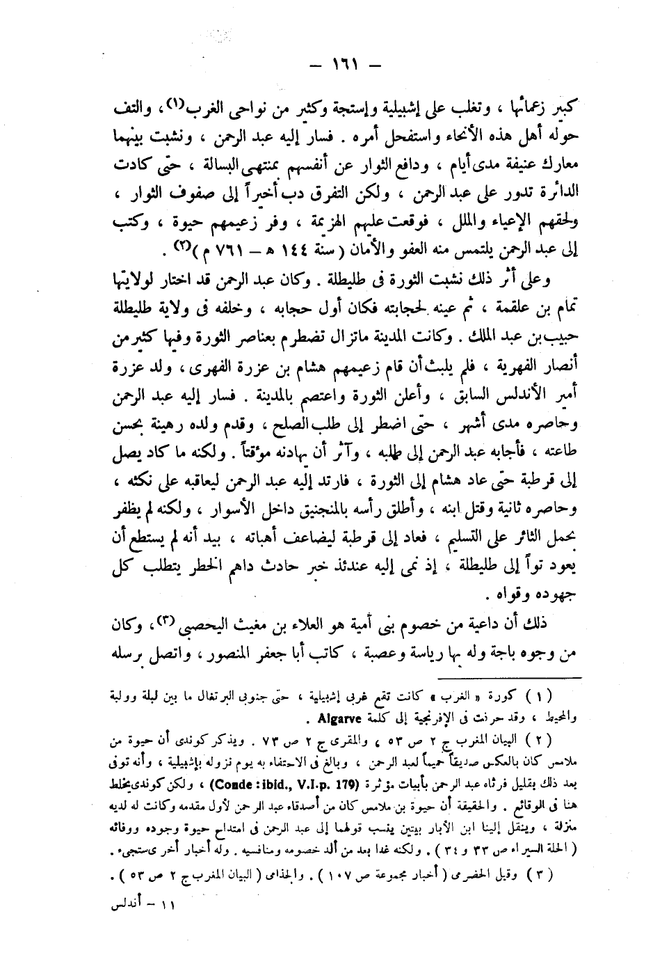 كبير زعمائها، وتغلب على إشبيلية وإستجة وكثير من نواحي الغرب (¬1)، والتف حوله أهل هذه الأنحاء واستفحل أمره. فسار إليه عبد الرحمن، ونشبت بينهما معارك عنيفة مدى أيام، ودافع الثوار عن أنفسهم بمنتهى البسالة، حتى كادت الدائرة تدور على عبد الرحمن، ولكن التفرق دب أخيراً إلى صفوف الثوار، ولحقهم الإعياء والملل، فوقعت عليهم الهزيمة، وفر زعيمهم حيوة، وكتب إلى عبد الرحمن يلتمس منه العفو والأمان (سنة 144هـ - 761م) (¬2).