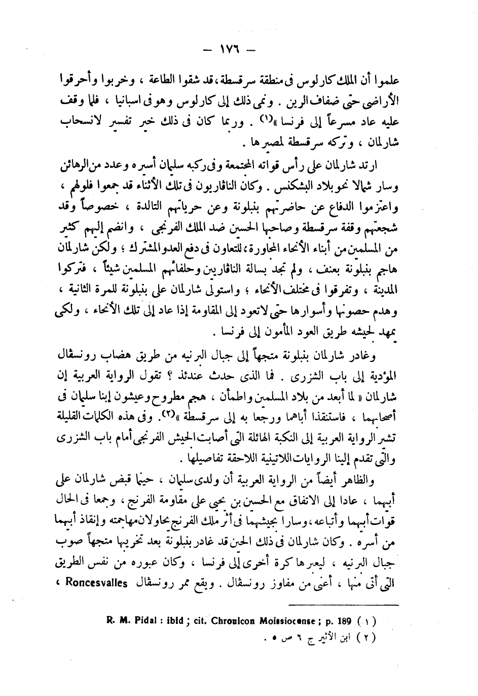 وغادر شارلمان بنبلونة متجهاً إلى جبال البرنيه من طريق هضاب رونسفال المؤدية إلى باب الشزري. فما الذي حدث عندئذ؟ تقول الرواية العربية إن شارلمان " لما أبعد من بلاد المسلمين واطمأن، هجم مطروح وعيشون إبنا سليمان في أصحابهما، فاستنقذا أباهما ورجعا به إلى سرقسطة " (¬2). وفي هذه الكلمات القليلة تشير الرواية العربية إلى النكبة الهائلة التي أصابت الجيش الفرنجي أمام باب الشزري والتي تقدم إلينا الروايات اللاتينية اللاحقة تفاصيلها.