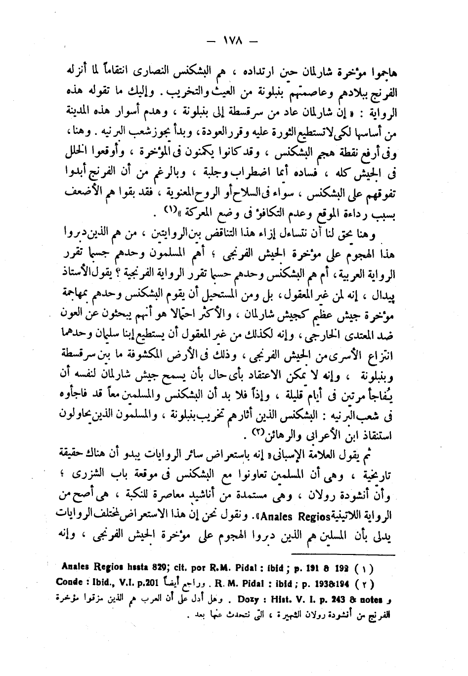 (¬2) R.M.Pidal: ibid ; p. 193 & 194 وراجع أيضا Conde: ibid, V.I. P.201 و Dozy: Hist.V.I.p. 243 & notes وهل أدل على أن العرب هم الذين مزقوا مؤخرة الفرنج من أنشودة رولان الشهيرة، التي نتحدث عنها بعد.