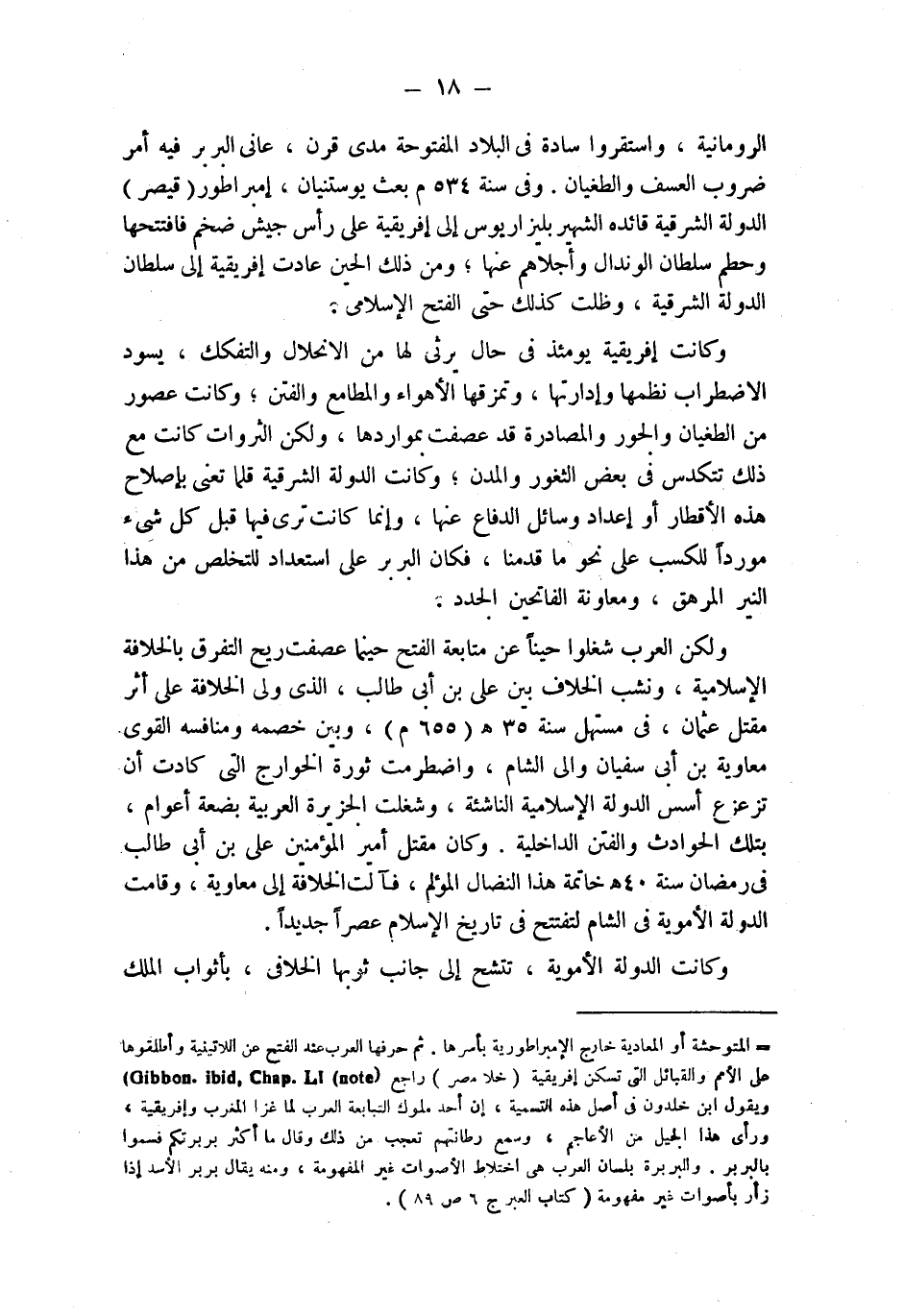 الرومانية، واستقروا سادة في البلاد المفتوحة مدى قرن، عانى البربر فيه أمر ضروب العسف والطغيان. وفي سنة 534 م بعث يوستنيان، إمبراطور (قيصر) الدولة الشرقية قائده الشهير بليزاريوس إلى إفريقية على رأس جيش ضخم فافتتحها وحطم سلطان الوندال وأجلاهم عنها؛ ومن ذلك الحين عادت إفريقية إلى سلطان الدولة الشرقية، وظلت كذلك حتى الفتح الإسلامى.