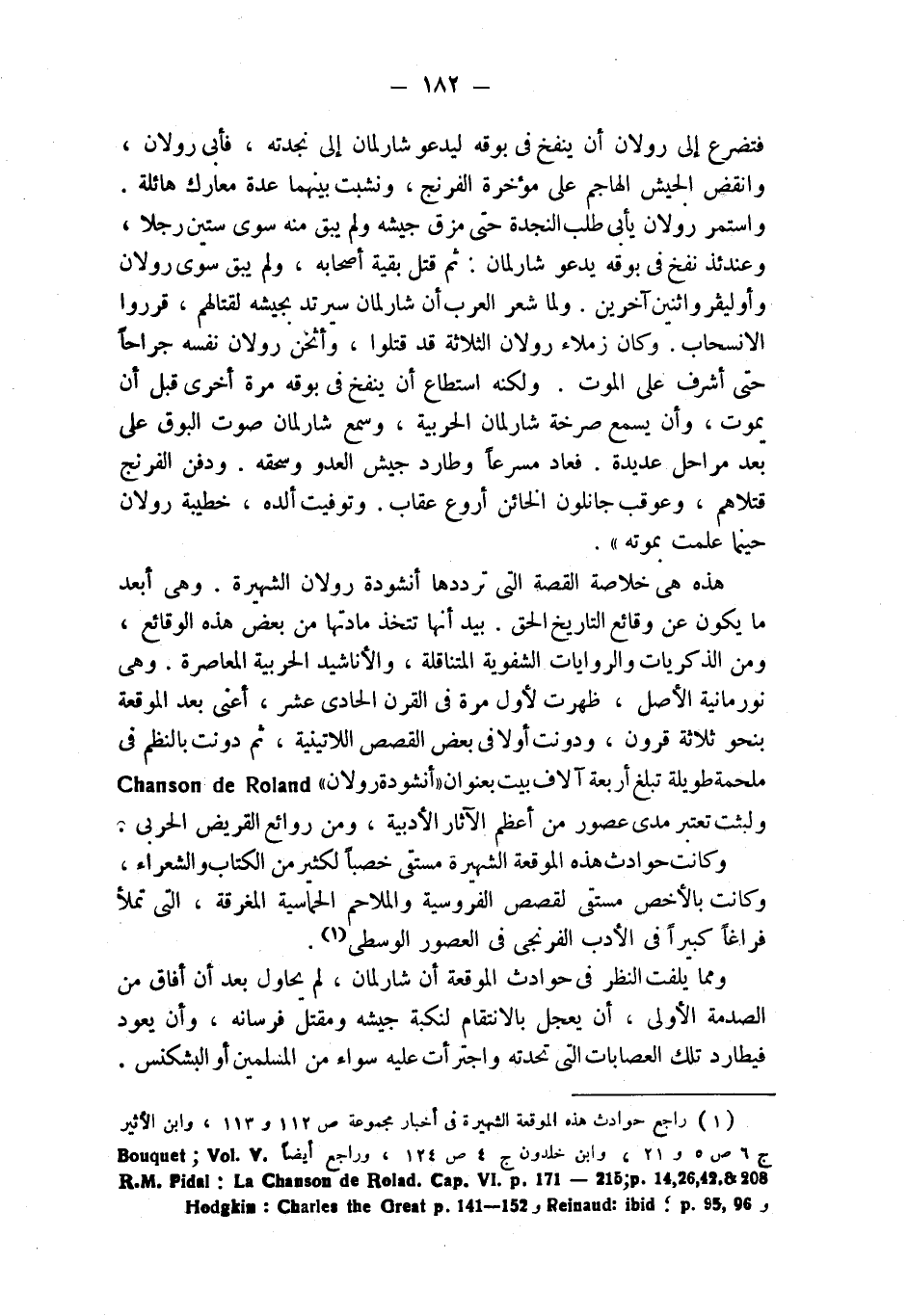 (¬1) راجع حوادث هذه الموقعة الشهيرة في أخبار مجموعة ص 112 و113، وابن الأثير ج 6 ص 5 و21، وابن خلدون ج 4 ص 124، وراجع أيضا Bouquet ; Vol.V.R.M. Pidal: La Chanson de Roland.Cap. VI.p. 171 - 215;p. 14,26,42. & 208 و Reinaud: ibid: p. 95,96 و Hodgkin: Charles the Great p. 141-152.