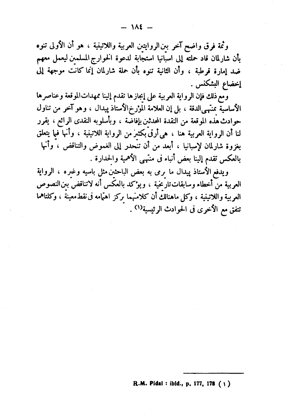 ومع ذلك فإن الرواية العربية على إيجازها تقدم إلينا ممهدات الموقعة وعناصرها الأساسية بمنتهي الدقة، بل إن العلامة المؤرخ الأستاذ بيدال، وهو آخر من تناول حوادث هذه الموقعة من النقدة المحدثين بإفاضة، وبأسلوبه النقدي الرائع، يقرر لنا أن الرواية العربية هنا، هي أرقى بكثير من الرواية اللاتينية، وأنها فيما يتعلق بغزوة شارلمان لإسبانيا، أبعد من أن تنحدر إلى الغموض والتناقض، وأنها بالعكس تقدم إلينا بعض أنباء في منتهى الأهمية والجدارة.