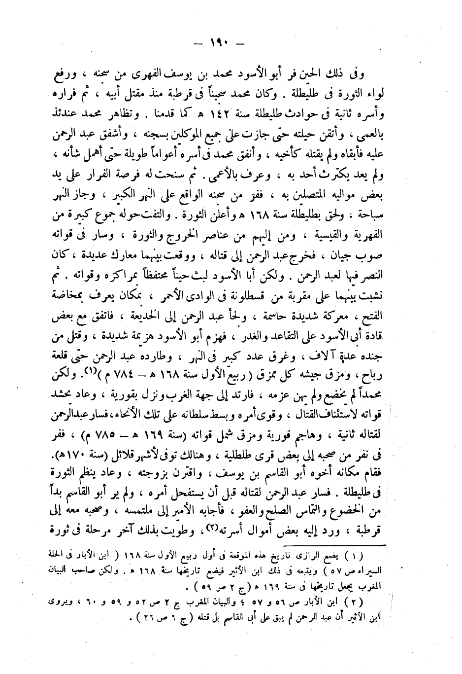 (¬1) يضع الرازي تاريخ هذه الموقعة في أول ربيع الأول سنة 168 (ابن الأبار في الحلة السيراء ص 57) ويتبعه في ذلك ابن الأثير فيضع تاريخها سنة 168هـ. ولكن صاحب البيان المغرب يجعل تاريخها في سنة 169هـ (ج 2 ص 59).