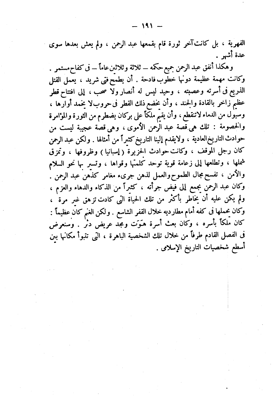 الفهرية، بل كانت آخر ثورة قام بقمعها عبد الرحمن، ولم يعش بعدها سوى عدة أشهر. وهكذا أنفق عبد الرحمن جميع حكمه - ثلاثة وثلاثين عاما - في كفاح مستمر. وكانت مهمة عظيمة دونها خطوب فادحة. أن يطمح فتى شريد، يعمل القتل الذريع في أسرته وعصبته، وحيد ليس له أنصار ولا صحب، إلى افتتاح قطر عظيم زاخر بالقادة والجند، وأن يخضع ذلك القطر في حروب لا يخمد أوارها، وسيول من الدماء لا تنقطع، وأن يقيم ملكاً على بركان يضطرم من الثورة والمؤامرة والخصومة: تلك هي قصة عبد الرحمن الأموي، وهي قصة عجيبة ليست من حوادث التاريخ العادية، ولايقدم إلينا التاريخ كثيرا من أمثالها. ولكن عبد الرحمن كان رجل الموقف، وكانت حوادث الجزيرة (إسبانيا) وظروفها، وتمزق شملها، وتطلعها إلى زعامة قوية توحد كلمتها وقواها، وتسير بها نحو السلام والأمن، تفسح مجال الطموح والعمل لذهن جرىء مغامر كذهن عبد الرحمن. وكان عبد الرحمن يجمع إلى فيض جرأته، كثيراً من الذكاء والدهاء والعزم، ولم يكن عليه أن يخاطر بأكثر من تلك الحياة التي كادت تزهق غير مرة، وكان يحملها في كفه أمام مطارديه خلال القفر الشاسع. ولكن الغنم كان عظيما: كان ملكا بأسره، وكان بعث أسرة هَوَت ومجد عريض دثر. وسنعرض في الفصل القادم طرفا من خلال تلك الشخصية الباهرة، التي تتبوأ مكانها بين أسطع شخصيات التاريخ الإسلامي.
