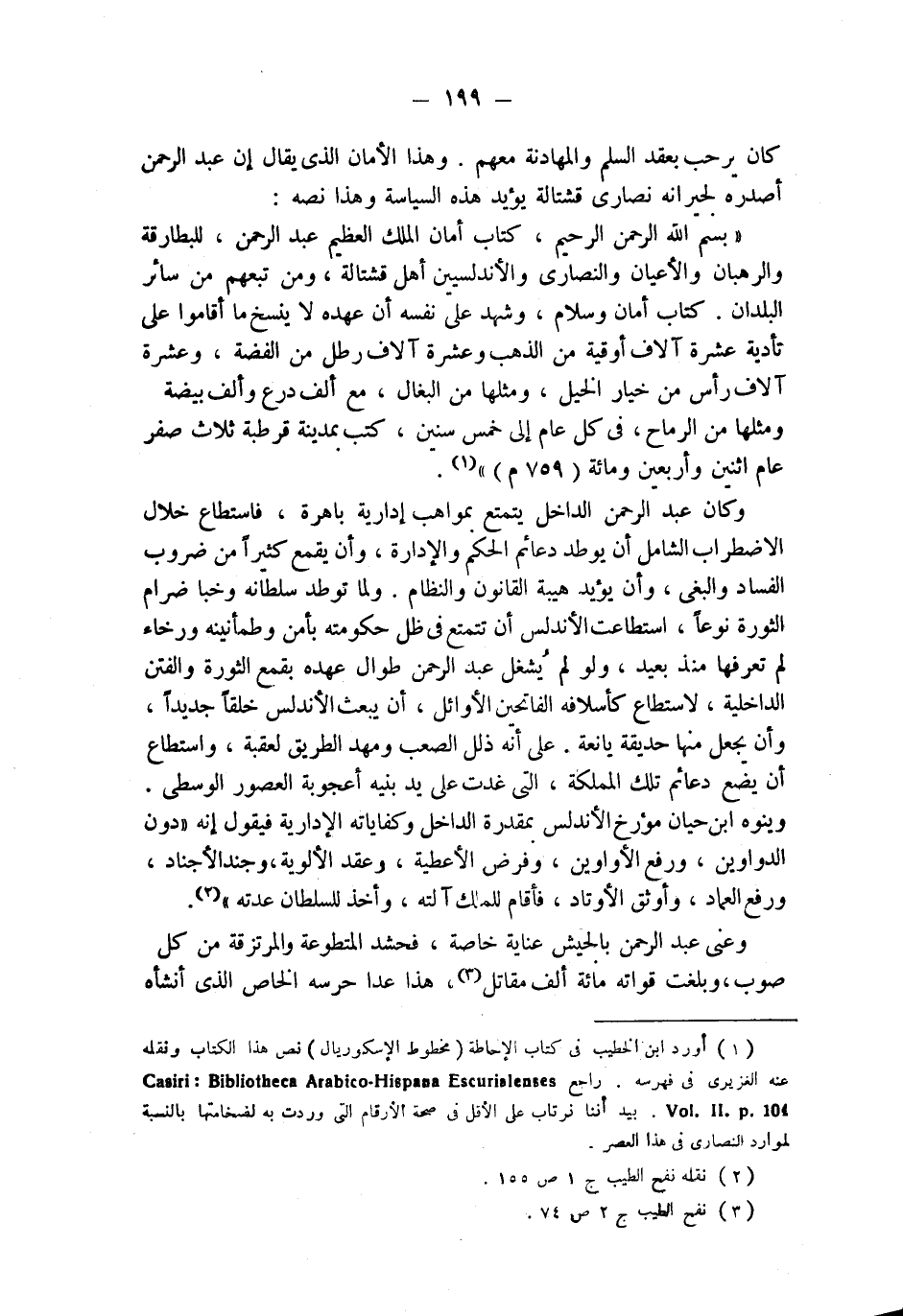 (¬1) أورد ابن الخطيب في كتاب الإحاطة (مخطوط الإسكوريال) نص هذا الكتاب ونقله عنه الغزيري في فهرسه. راجع Casiri: Bibliotheca Arabico - Hispana Escurialenses.Vol.II.p. 104. بيد أننا نرتاب على الأقل في صحة الأرقام التي وردت به لضخامتها بالنسبة لموارد النصارى في هذا العصر.