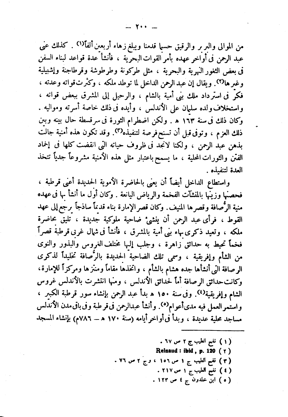 واستطاع الداخل أيضاً أن يعني بالحاضرة الأموية الجديدة أعني قرطبة، فحصنها وزينها بالمنشآت الفخمة والرياض اليانعة. وكان أول ما أنشأ بها في عهده منية الرُّصافة وقصرها المنيف. وكان قصر الإمارة بناء قديماً ساذجاً يرجع إلى عهد القوط، فرأى عبد الرحمن أن ينشئ ضاحية ملوكية جديدة، تليق بحاضرة ملكه، وتعيد ذكرى بهاء بني أمية بالمشرق، فأنشأ في شمال غربي قرطبة قصراً فخماً تحيط به حدائق زاهرة، وجلب إليها مختلف الغروس والبذور والنوى من الشأم وإفريقية، وسمى تلك الضاحية الجديدة بالرُّصافة تخليداً لذكرى الرُّصافة التي أنشأها جده هشام بالشأم، واتخذها مقاماً ومنتزهاً ومركزاً للإمارة، وكانت حدائق الرصافة أماً لحدائق الأندلس، ومنها انتشرت بالأندلس غروس الشام وإفريقية (¬4). وفي سنة 150هـ بدأ عبد الرحمن بإنشاء سور قرطبة الكبير، واستمر العمل فيه مدى أعوام (¬5). وأنشأ عبد الرحمن في قرطبة وفي باقي مدن الأندلس مساجد محلية عديدة، وبدأ في أواخر أيامه (سنة 170 هـ - 786 م) بإنشاء المسجد