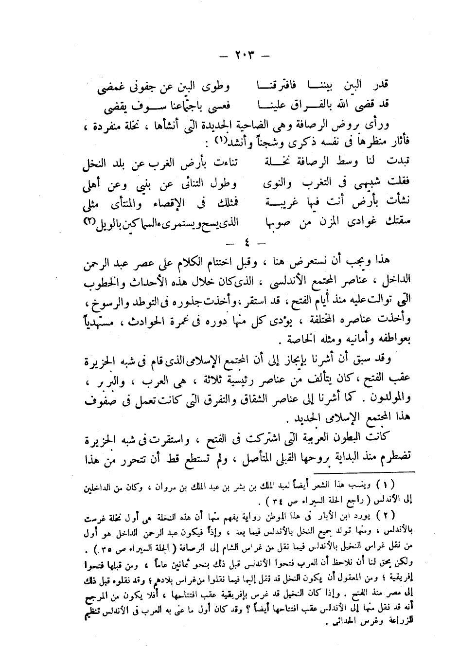 (¬2) يورد ابن الأبار في هذا الموطن رواية يفهم منها أن هذه النخلة هي أول نخلة غرست بالأندلس، ومنها تولد جميع النخيل بالأندلس فيما بعد، وإذا فيكون عبد الرحمن الداخل هو أول من نقل غراس النخيل بالأندلس فيما نقل من غراس الشام إلى الرصافة (الحلة السيراء ص 35). ولكن يحق لنا أن نلاحظ أن العرب فتحوا الأندلس قبل ذلك بنحو ثمانين عاما، ومن قبلها فتحوا إفريقية؛ ومن المعقول أن يكون النخل قد نقل إليها فيما نقلوا من غراس بلادهم؛ وقد نقلوه قبل ذلك إلى مصر منذ الفتح. وإذا كان النخيل قد غرس بإفريقية عقب افتتاحها، أفلا يكون من المرجح أنه قد نقل منها إلى الأندلس عقب افتتاحها أيضا؟ وقد كان أول ما عنى به العرب في الأندلس تنظيم الزراعة وغرس الحدائق.