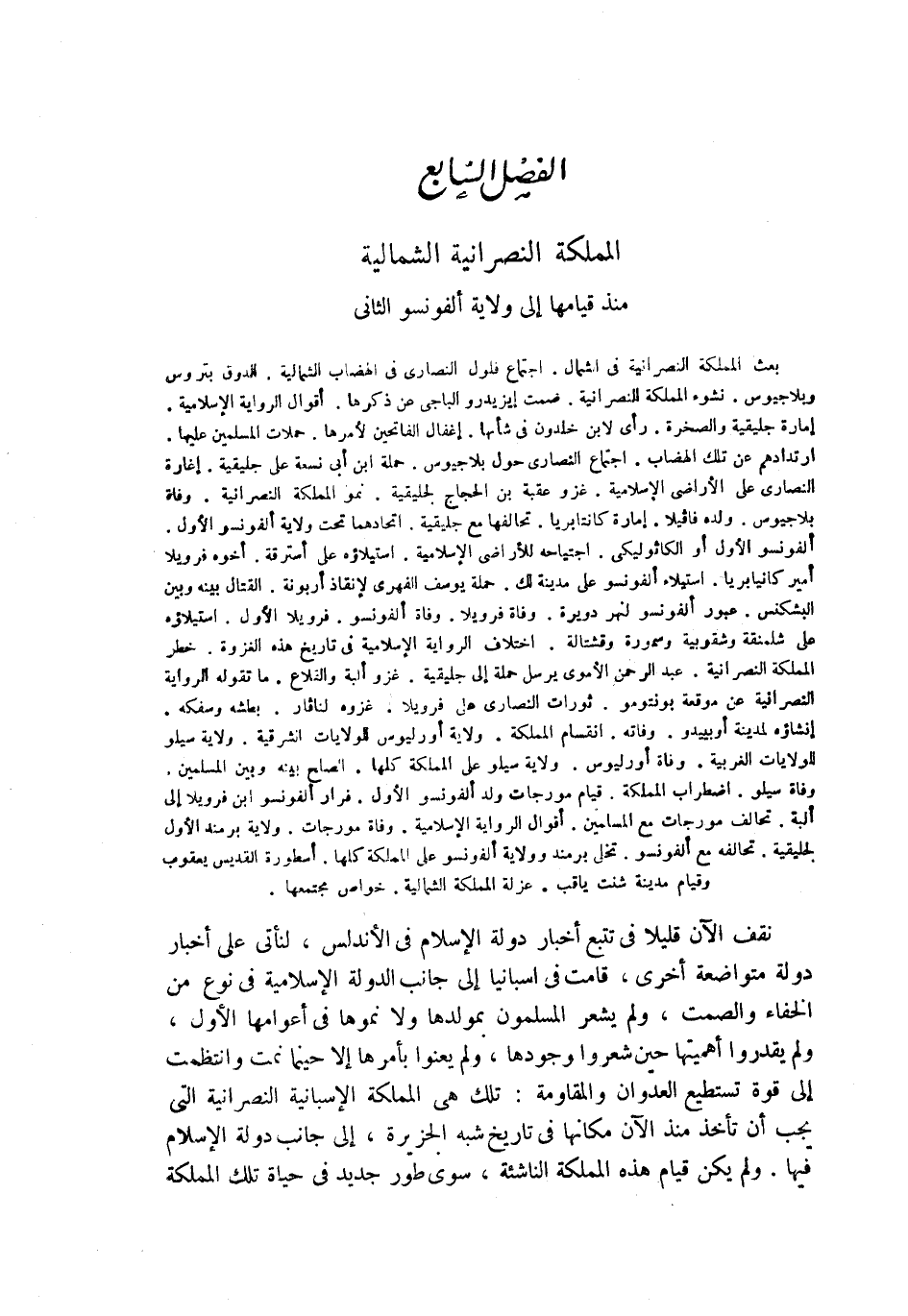 بعث المملكة النصرانية في الشمال. اجتماع فلول النصارى في الهضاب الشمالية. الدوق بتروس وبلاجيوس. نشوء المملكة النصرانية. صمت إيزيدرو الباجي عن ذكرها. أقوال الرواية الإسلامية. امارة جليقية والصخرة. رأى لابن خلدون في شأنها. إغفال الفاتحين لأمرها. حملات المسلمين عليها. ارتدادهم عن تلك الهضاب. اجتماع النصارى حول بلاجيوس. حملة ابن أبي نسعة على جليقية. إغارة النصارى على الأراضي الإسلامية. غزو عقبة بن الحجاج لجليقية. نمو المملكة النصرانية. وفاة بلاجيوس. ولده فافيلا. إمارة كانتابريا. تحالفها مع جليقية. اتحادهما تحت ولاية ألفونسو الأول. ألفونسو الأول أو الكاثوليكي. اجتياحه للأراضي الإسلامية. استيلاؤه على أسترقة. أخوه فرويلا أمير كانتابريا. استيلاء ألفونسو على مدينة لك. حملة يوسف الفهري لإنقاذ أربونة. القتال بينه وبين البشكنس. عبور ألفونسو لنهر دويرة. وفاة فرويلا. وفاة ألفونسو. فرويلا الأول. استيلاؤه على شلمنقة وشقوبية وسمورة وقشتالة. اختلاف الرواية الإسلامية في تاريخ هذه الغزوة. خطر المملكة النصرانية. عبد الرحمن الأموي يرسل حملة إلى جليقية. غزو ألبة والقلاع. ما تقوله الرواية النصرانية عن موقعة بونتومو. ثورات النصارى على فرويلا. غزوه لنافار. بطشه وسفكه. إنشاؤه لمدينة أوبييدو. وفاته. انقسام المملكة. ولاية أورليوس للولايات الشرقية. ولاية سيلو للولايات الغربية. وفاة أورليوس. ولاية سيلو على المملكة كلها. الصلح بينه وبين المسلمين. وفاة سيلو. اضطراب المملكة. قيام مورجات ولد ألفونسو الأول. فرار ألفونسو ابن فرويلا إلى ألبة. تحالف مورجات مع المسلمين. أقوال الرواية الاسلامية. وفاة مورجات. ولاية برمند الأول لجليقية. تحالفه مع ألفونسو. تخلي برمند وولاية ألفونسو على المملكة كلها. أسطورة القديس يعقوب وقيام مدينة شنت ياقب. عزلة المملكة الشمالية. خواص مجتمعها.